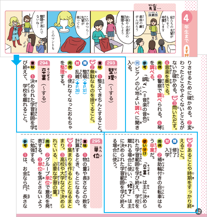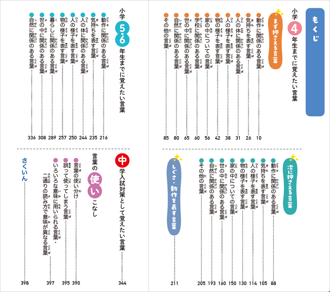 「小学4年生までに」「小学5・6年生までに」というように、どれだけのことばをどの学年までに覚えればいいのかをわかりやすく分類。一つのことばに対し、意味、類義語・対義語、用例などを載せているので、しっかり理解できます。