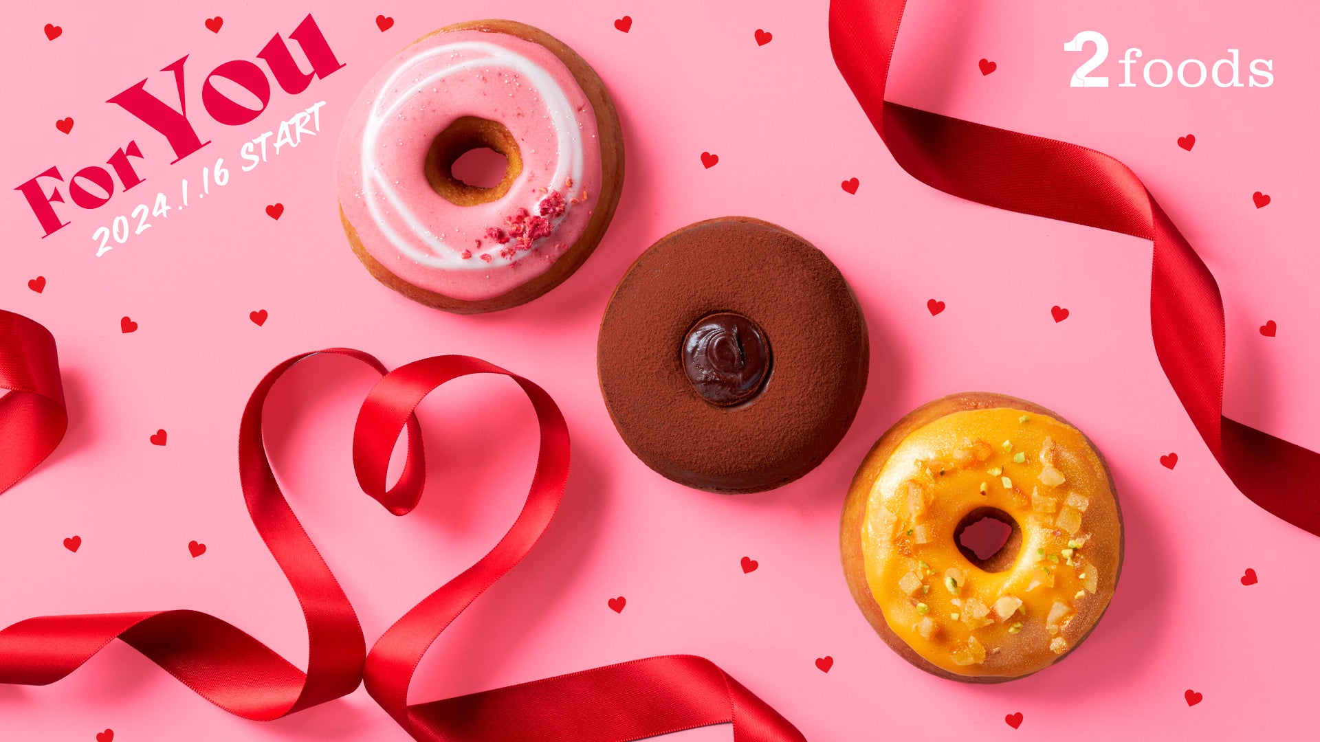 バレンタインシーズンの商品として2foodsからは、「フォー・ユードーナツコレクション」を発売いたします。ドーナツの丸い形には終わりがないと言われており、“これからはじまる縁”や、“続いていく縁”を繋いでいくことをイメージし、「For you」をテーマに展開。ドーナツの円から連想し、贈っても、もらってもうれしい、キラリと輝く宝石をイメージしたビジュアルや、冬の寒い時期に食べたくなるチョコレート、多種多様なフルーツが織りなすハーモニーを楽しめるプラントベースドーナツをご用意いたしました。