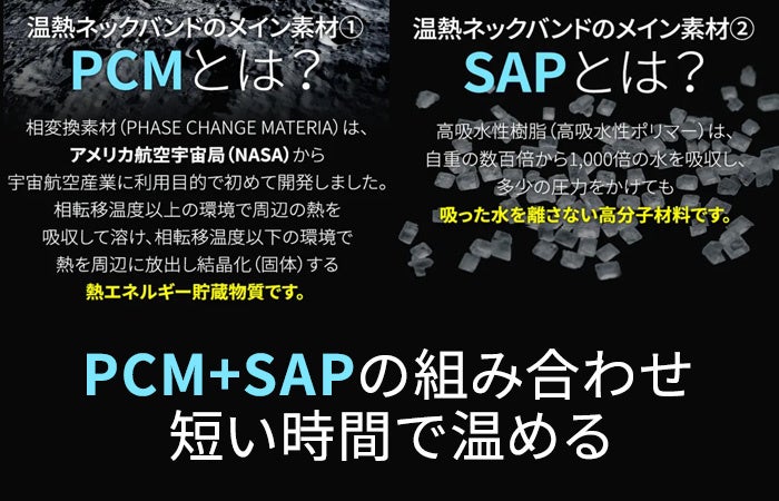 ネッククーラーで使用されているPCM素材にSAP素材を組み合わせて、短い時間で温められるように開発されています。何度も繰り返して、だれでも簡単に使用できるように電子レンジだけであたためられうように工夫されています。