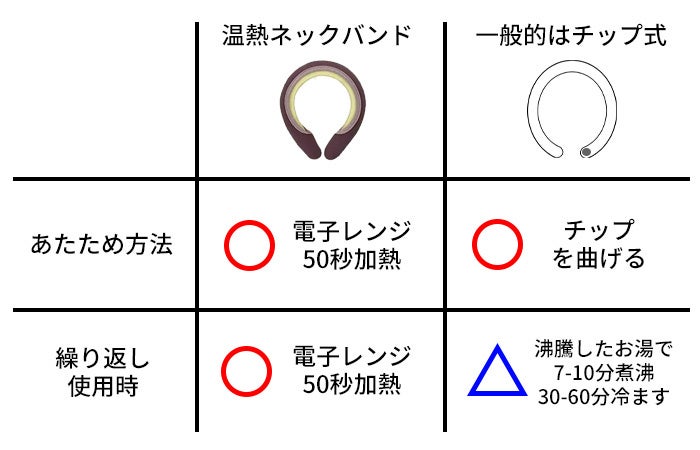 すでに販売されているチップ式のホットネックバンドもありますが、チップ式は使用後に再使用するときは、沸騰したお湯での煮沸が必要になり、とても面倒です。お湯をかけるだけや、煮沸時間が短いと固くなってしまいとても面倒です。