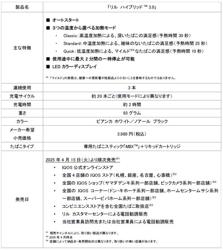 フィリップ モリス ジャパン合同会社(本社:東京都千代田区、社長:シェリー・ゴー、以下PMJ)は、KT&G製の煙の出ない加熱式たばこ機器「lil HYBRID™(リル ハイブリッド™) 3.0」を、2025年4月15日(火)※1よりIQOS公式オンラインストア、全国4店舗のIQOSストア※2、IQOSショップ(ヤマダデンキ系列一部店舗、ビックカメラ系列一部店舗)、IQOSコーナー(ドン・キホーテ系列一部店舗、ホームセンタームサシ系列一部店舗、スーパービバホーム系列一部店舗)※2、コンビニエンスストアを含む全国たばこ取扱店※3、リル カスタマーセンターによる電話勧誘、当社営業員訪問先または当社営業員による電話勧誘を通して順次発売いたします。