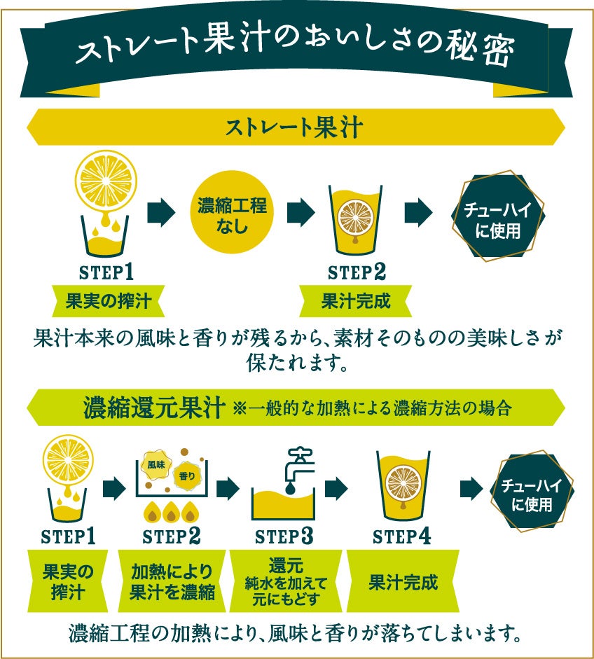 一般的に広く使用されている濃縮還元果汁では、加熱濃縮の際に果実の持つ水分と同時に香りや風味が損なわれ、熱によってオフフレーバー(望ましくない香味)が出てしまいます。一方、ストレート果汁は、加熱による濃縮工程を行わずに果汁が完成するため、果実本来の香りや風味が残り、美味しさが保たれます。