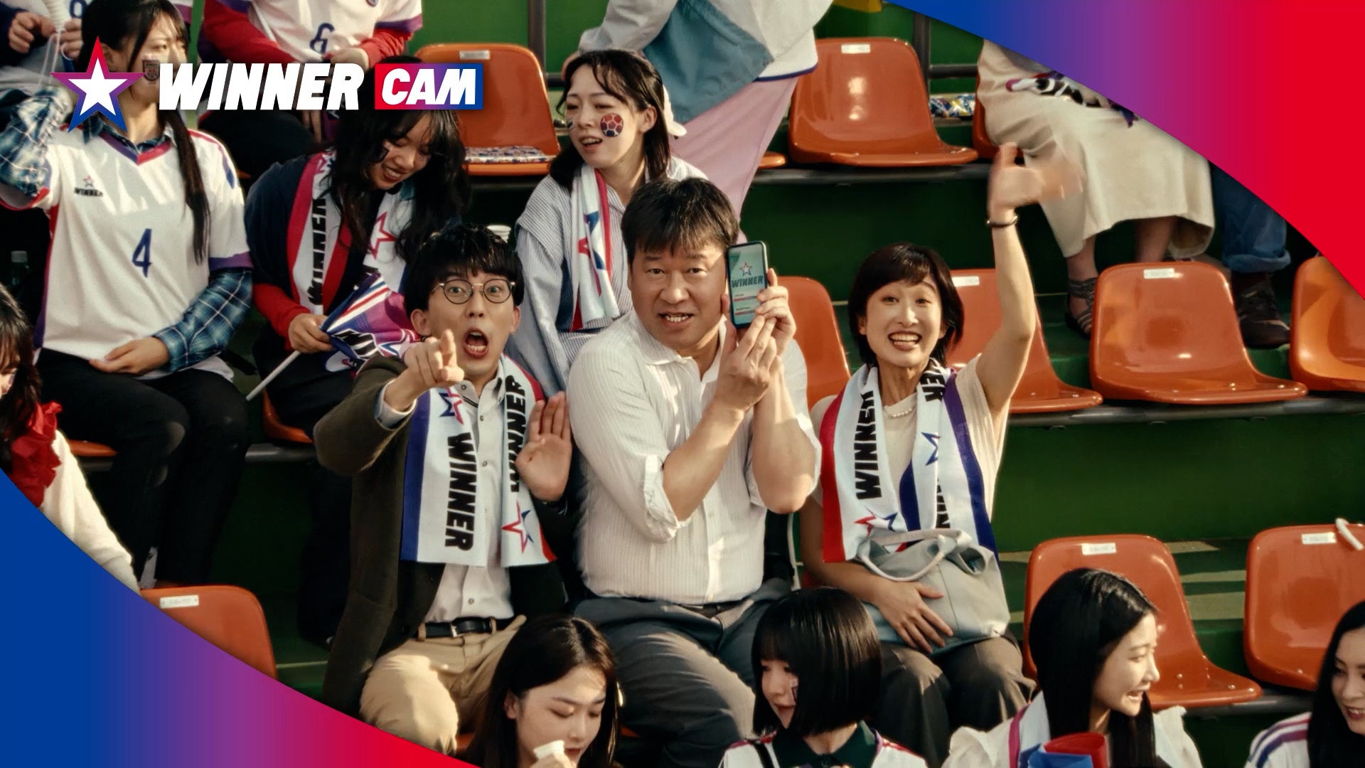 スマートフォンを片手に握りしめながら試合観戦をする佐藤二朗さん。試合が終盤に差し掛かると予想した試合結果に近づき、ますます応援に力が入ってくる。そして、シュートが決まると、興奮のあまり手をあげて勝利をよろこび、思わず「WINNER!!」と叫んでしまう。チームの勝利とWINNERの予想が的中して、“勝つよろこびが倍になる”様子を佐藤二朗さんが全身で表現しています。
