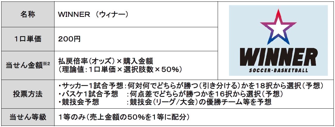 「WINNER」は、JリーグやB.LEAGUE等のリーグ戦・カップ戦の試合の中から好きな1試合を選び試合結果とスコアを予想するだけ。このほか、JリーグやB.LEAGUE等のリーグや大会といった競技会の優勝チーム等を予想するくじも販売いたします。いずれも1口200円で、スポーツファンからくじ好きの方まで気軽に楽しめるくじとなっています。「WINNER」を買うことで今まで以上に試合観戦に熱が入り、スポーツ応援の楽しみ方が広がります。また、「WINNER」の売上の一部は、スポーツ振興くじ助成の財源として活用されることに加えて、JリーグやB.LEAGUEを通じてクラブへ還元され、選手等のための環境整備やクラブ強化などに充当されます。