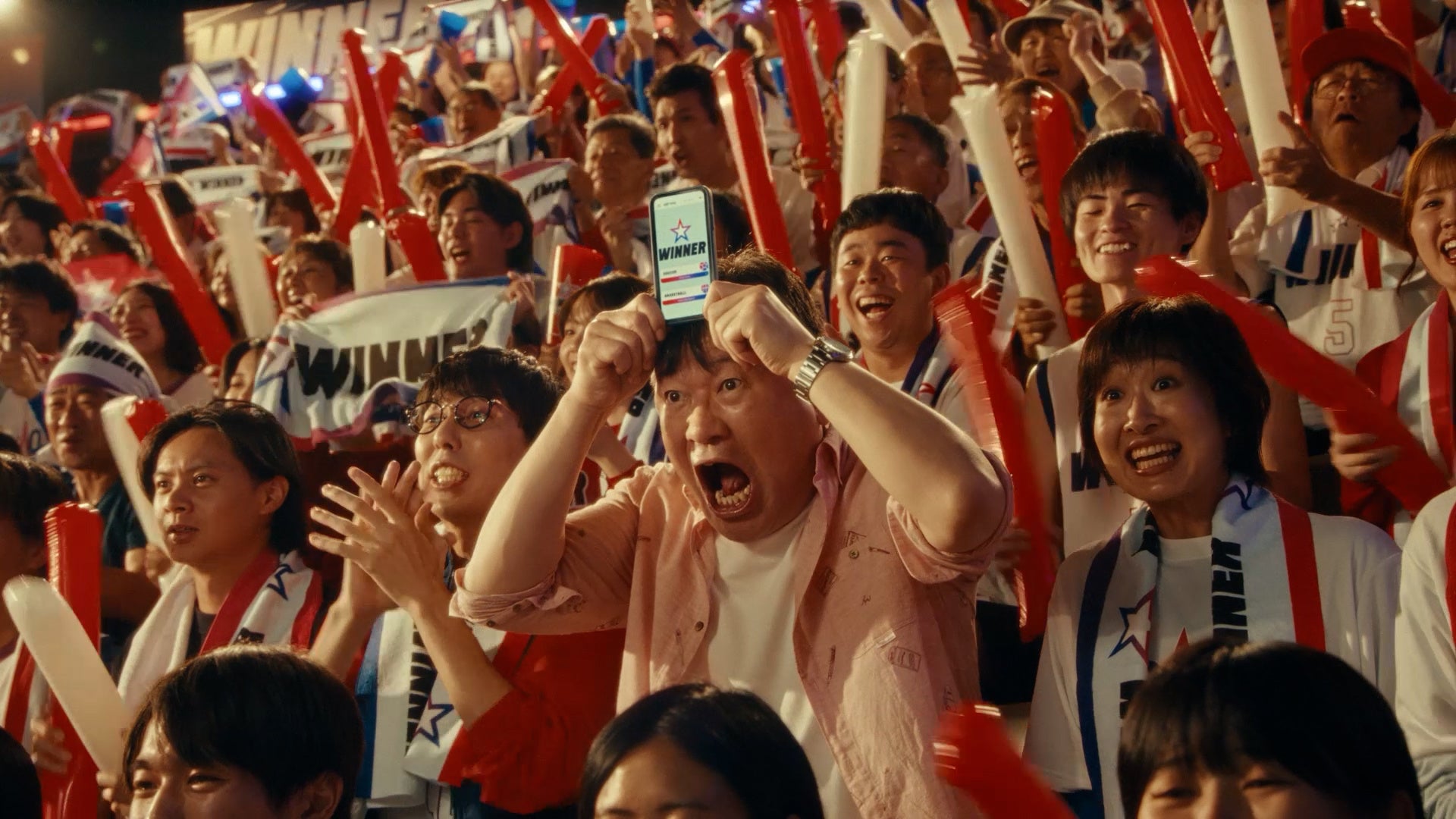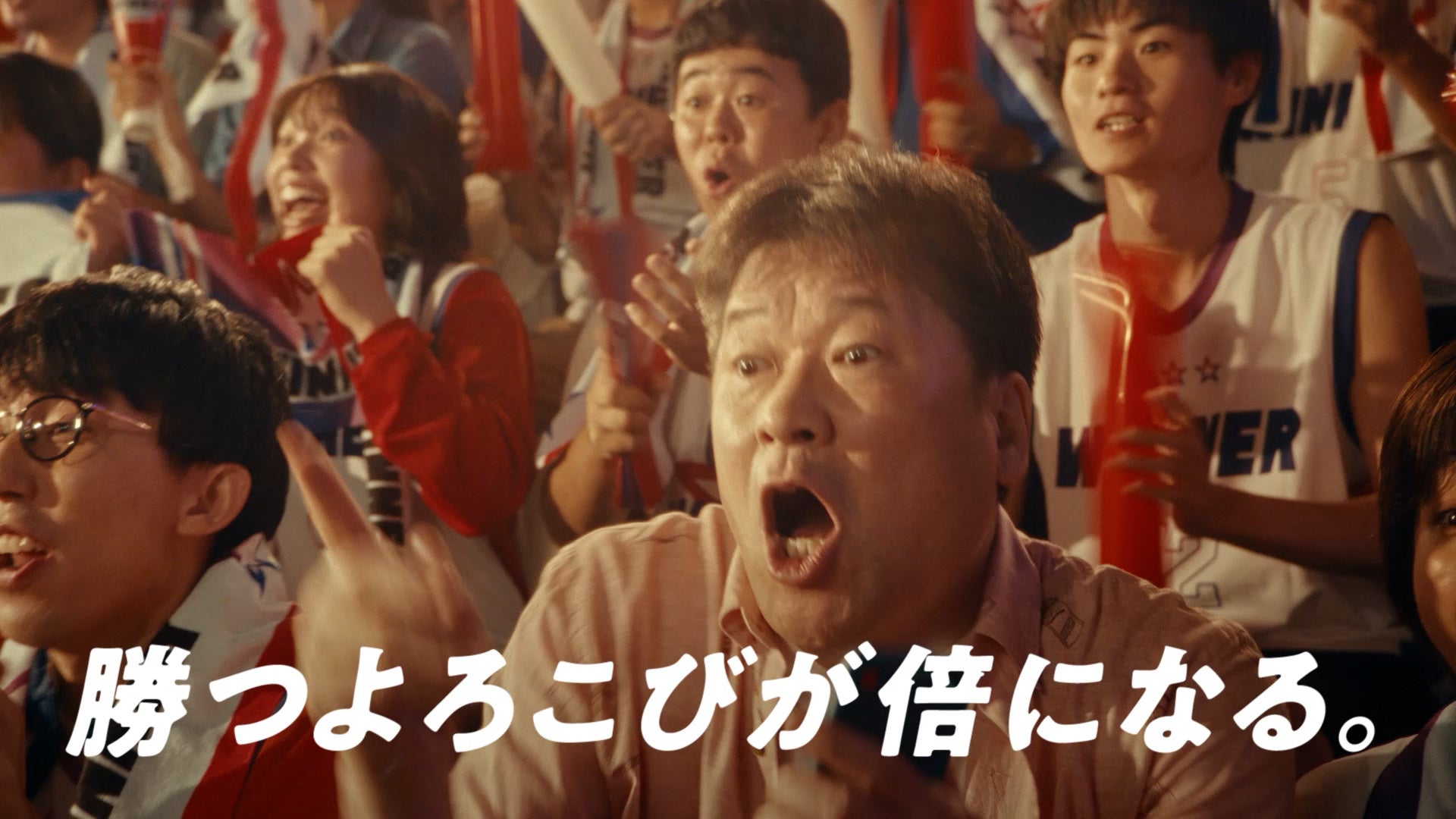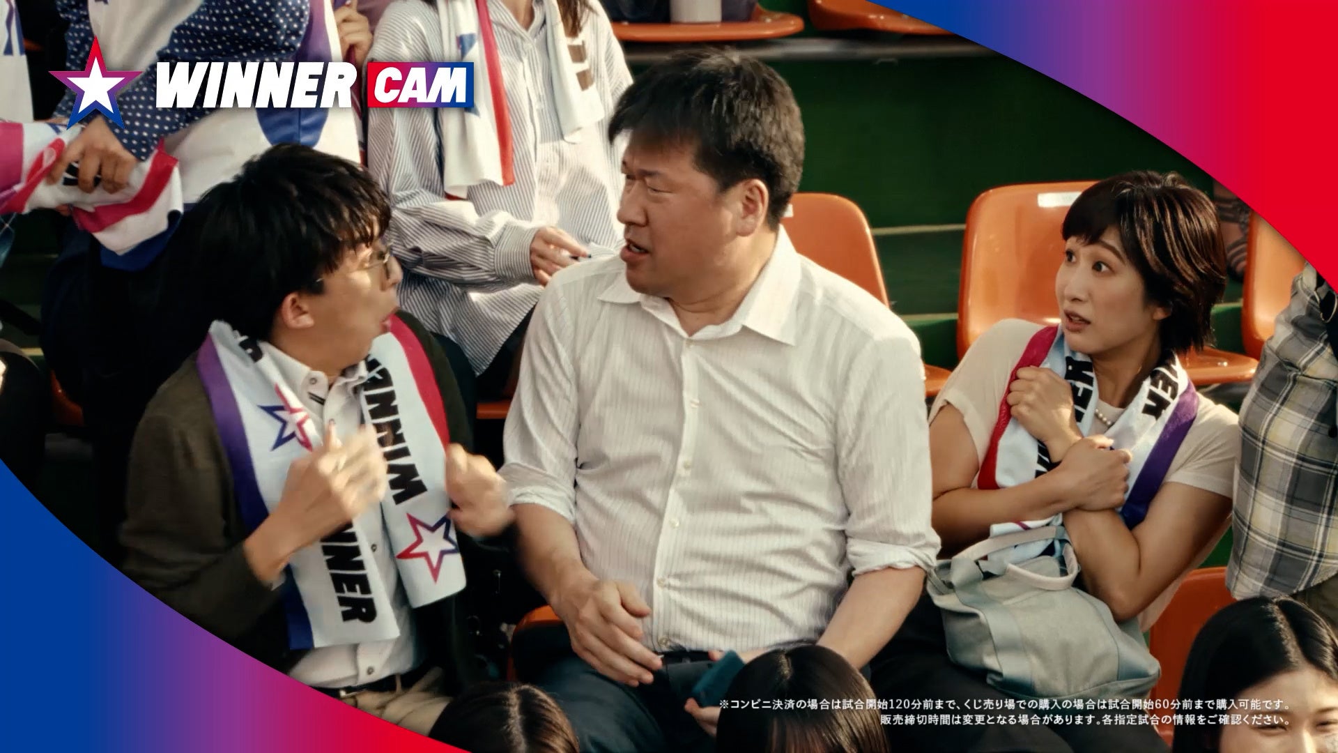試合前、観客席にいる佐藤二朗さんと同僚たちが、突然、場内のビジョンに映り込む。同僚とともに盛り上がっていると、佐藤二朗さんがアップで映し出される。少し緊張した表情の中、なぜかスマートフォンを見せながら「WINNER」について視聴者に語り始める。そして、同僚と「WINNER」を予想する様子も。最後には、同僚と試合結果によろこび、WINNERを楽しむことで“勝つよろこびが倍になる”姿を描いています。