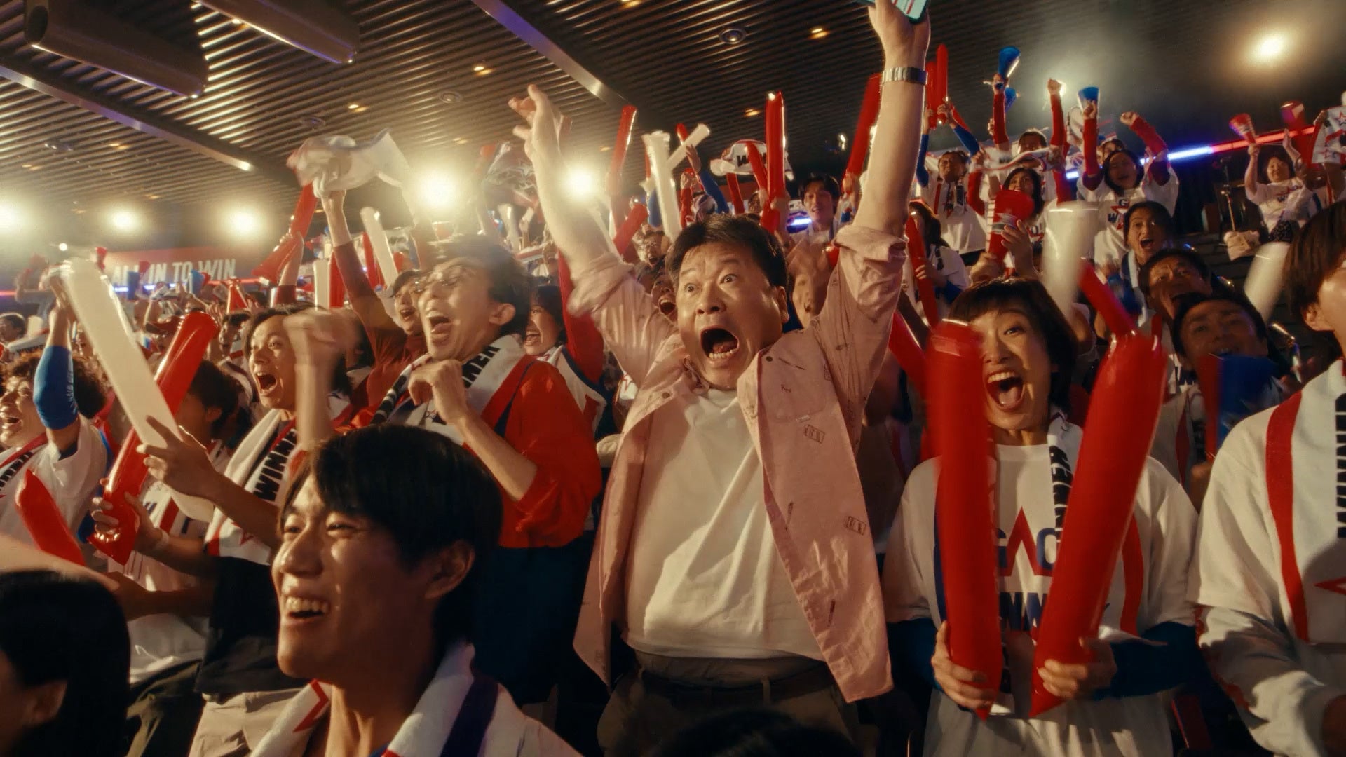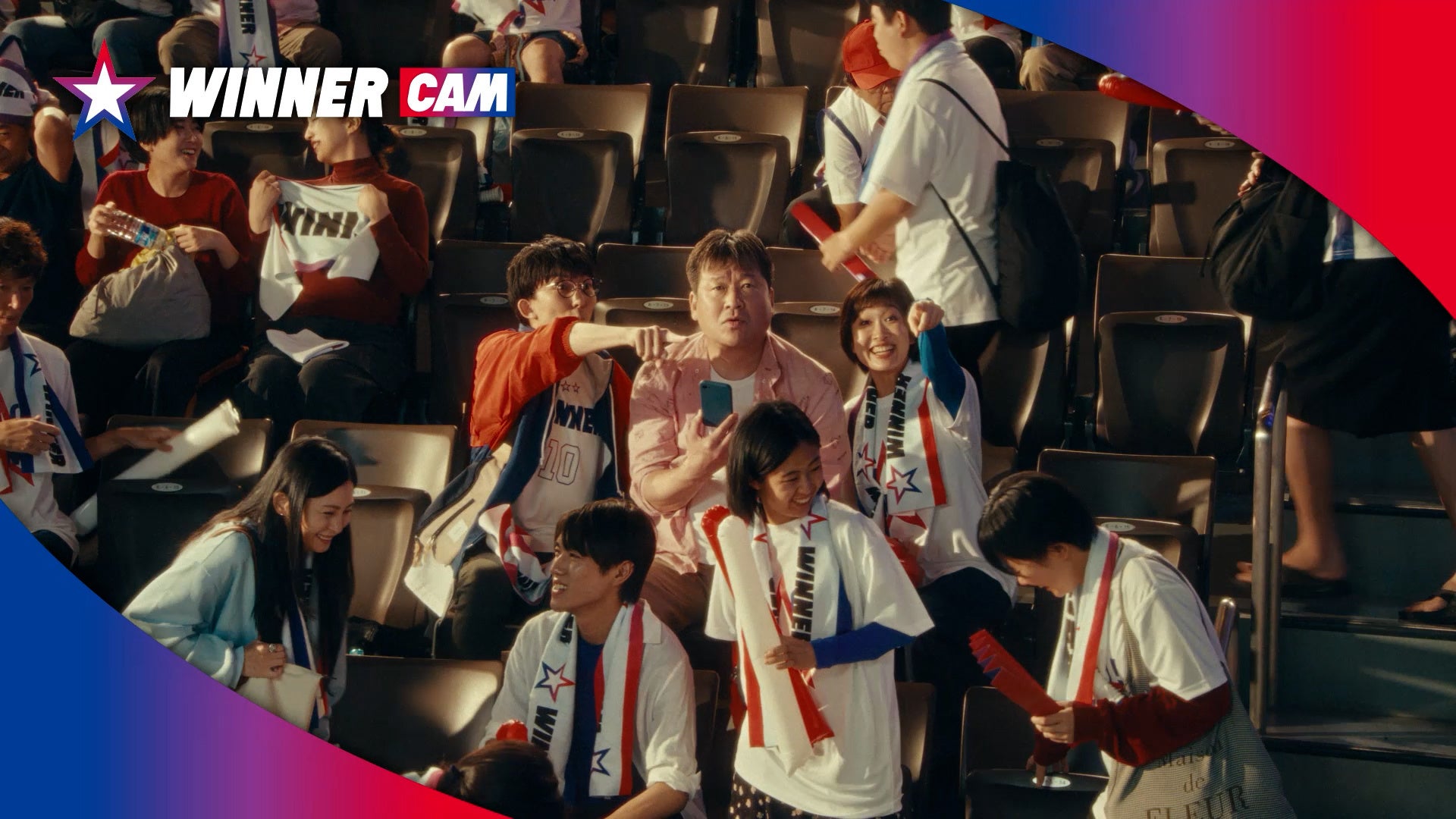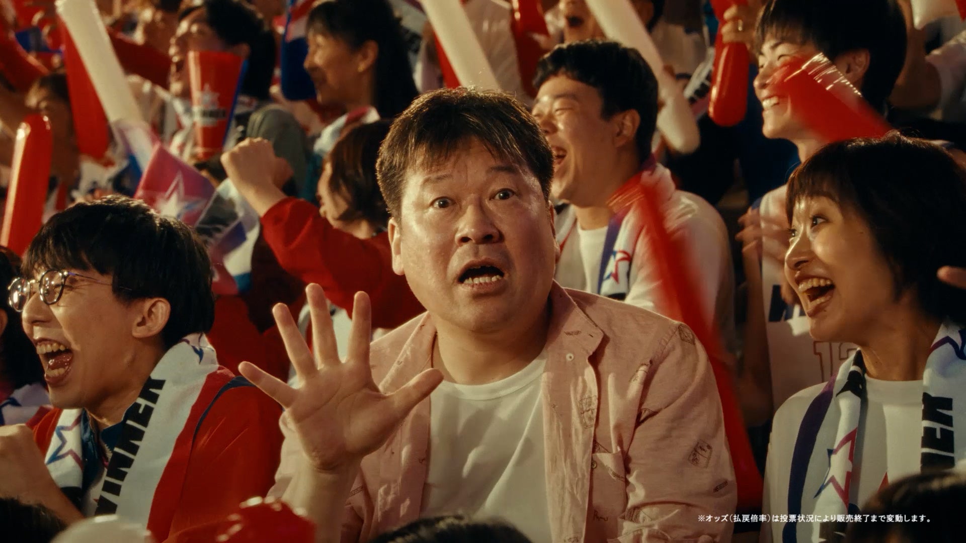 試合前、観客席にいる佐藤二朗さんと同僚たちが、突然、場内のビジョンに映り込む。同僚とともに盛り上がっていると、佐藤二朗さんがアップで映し出される。少し緊張した表情の中、なぜかスマートフォンを見せながら「WINNER」について視聴者に語り始める。そして、同僚と「WINNER」を予想する様子も。最後には、同僚と試合結果によろこび、WINNERを楽しむことで“勝つよろこびが倍になる”姿を描いています。