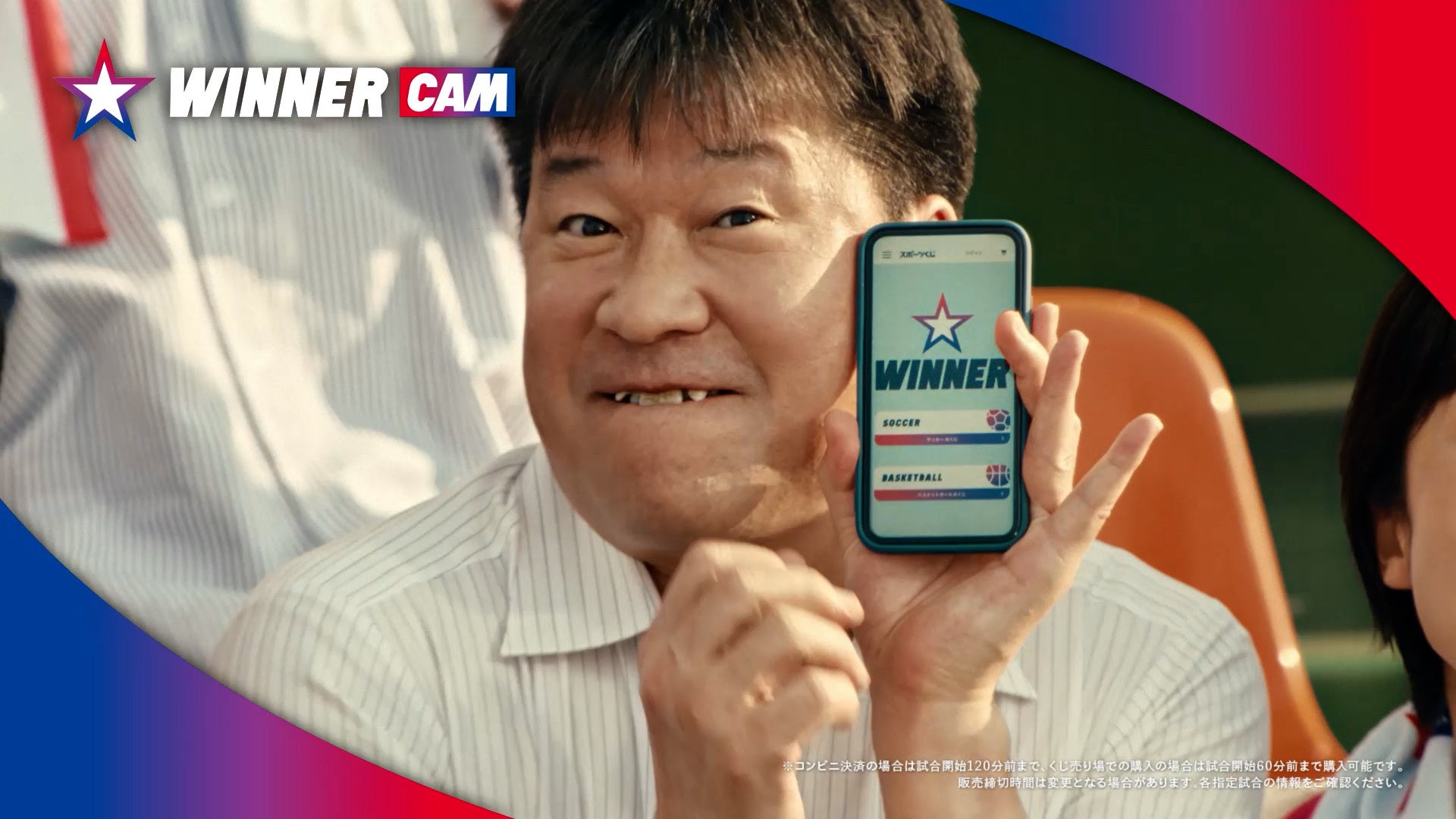 このたび放映される新WEBCMシリーズでは、佐藤二朗さんがスポーツ観戦しながら、WINNERを楽しむことで“勝つよろこびが倍になる”様子を描いています。「興奮しちゃう佐藤二朗さん」篇では、試合観戦する佐藤二朗さんがスマートフォンの画面を見ながらWINNERの予想を確認。シュートが決まり試合が終了すると、興奮のあまり手をあげて叫ぶ佐藤二朗さんの表情に注目です。また、「映っちゃう佐藤二朗さん」篇では、試合の開始を待つ佐藤二朗さんと同僚たちが場内のビジョンに映し出されます。佐藤二朗さんがアップになると突然スマートフォンの画面を見せて、視聴者に語りかけるように「WINNER」をお勧めする姿が見どころのCMです。