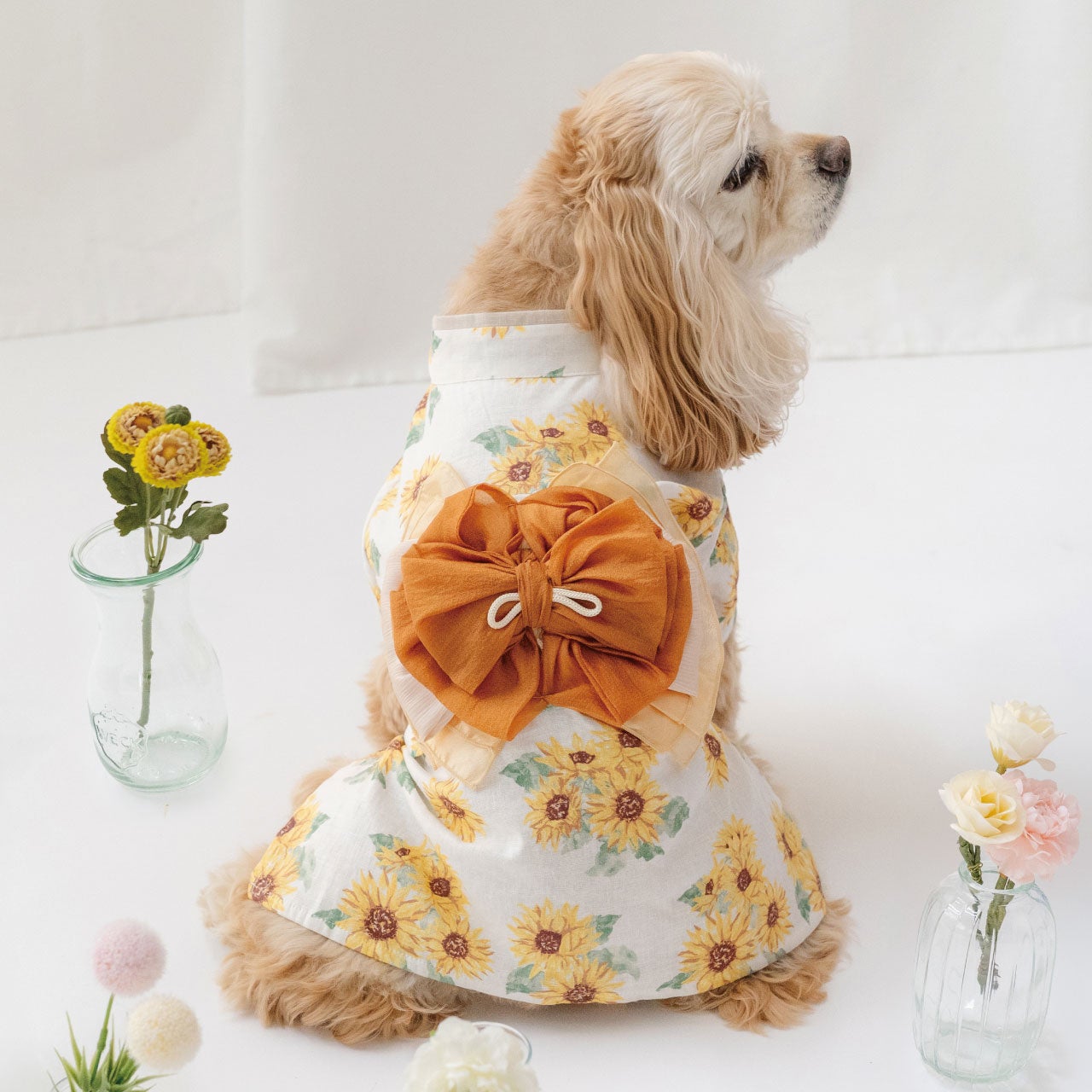 白地に大きく咲くひまわり柄が印象的な一着。麻混素材の涼しげな生地を使用し、ふんわりとした花結び風の帯で夏らしい華やかさを演出します。
