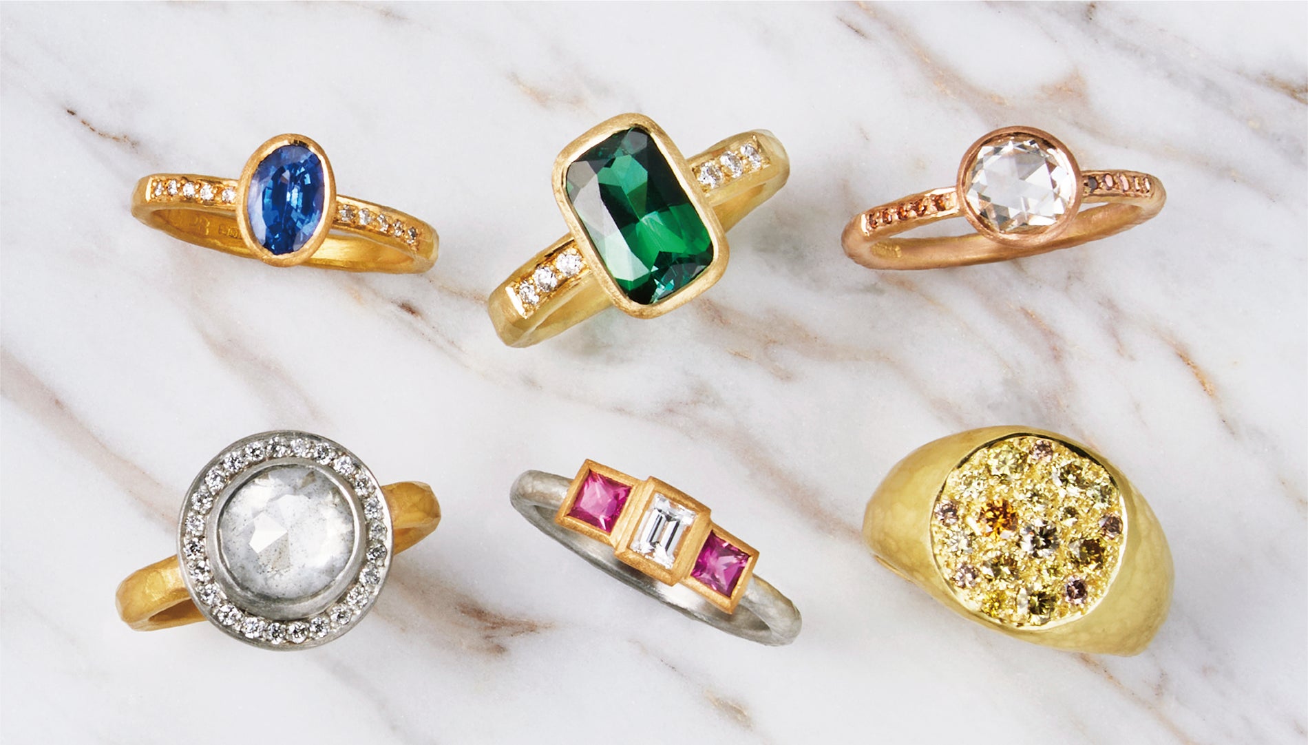 (左上)リング(22KYG・ブルーサファイア・ダイヤモンド)¥858,000、(中上)リング(18KYG・グリーントルマリン・ダイヤモンド)¥990,000、(右上)リング(18KRG・ダイヤモンド)¥1,430,000、(左下)リング(22KYG・プラチナ・ダイヤモンド)¥1,925,000、(中下)リング(プラチナ・22KYG・ダイヤモンド・ルビー)¥770,000、(右下)リング(18KYG・ダイヤモンド)¥1,210,000(全て税込)