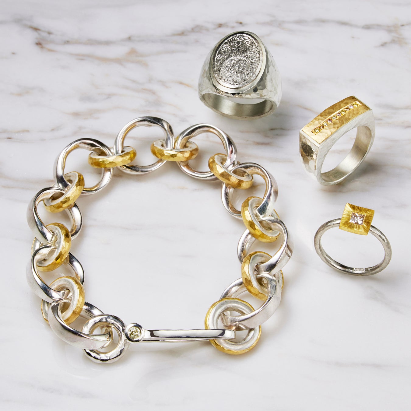 日本ではバーニーズ ニューヨークのみのお取扱いとなる英国 ロンドン発のファインジュエリーブランド<マルコム ベッツ>。取扱いを始めてから約30年もの長きに渡り、お客様やスタッフに愛され続けています。マルコム・ベッツ氏の作るジュエリーは“ハンマリング”という伝統的な技法を用い熟練した職人により一つひとつ丁寧にハンドメイドで作られ、マットで温もり溢れる質感が特徴です。そして、身につける人の使い方や生活環境のなかで、だんだんと艶が増し、よりパーソナルなものとして味わいを増していくのも大きな魅力です。