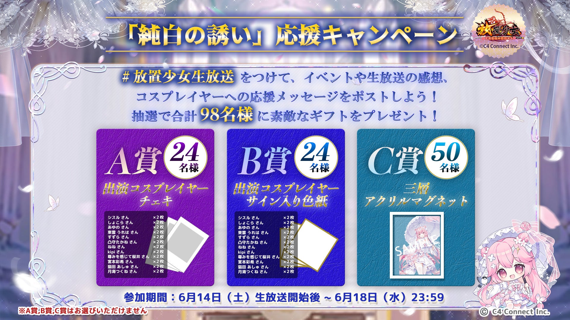 【放置少女】『純白の誘い~オフラインイベント&スペシャル生放送~』は6月14日(土)16時より配信!総勢12名の人気コスプレイヤーのサインチェキをはじめとする超豪華プレゼントキャンペーンを実施!
