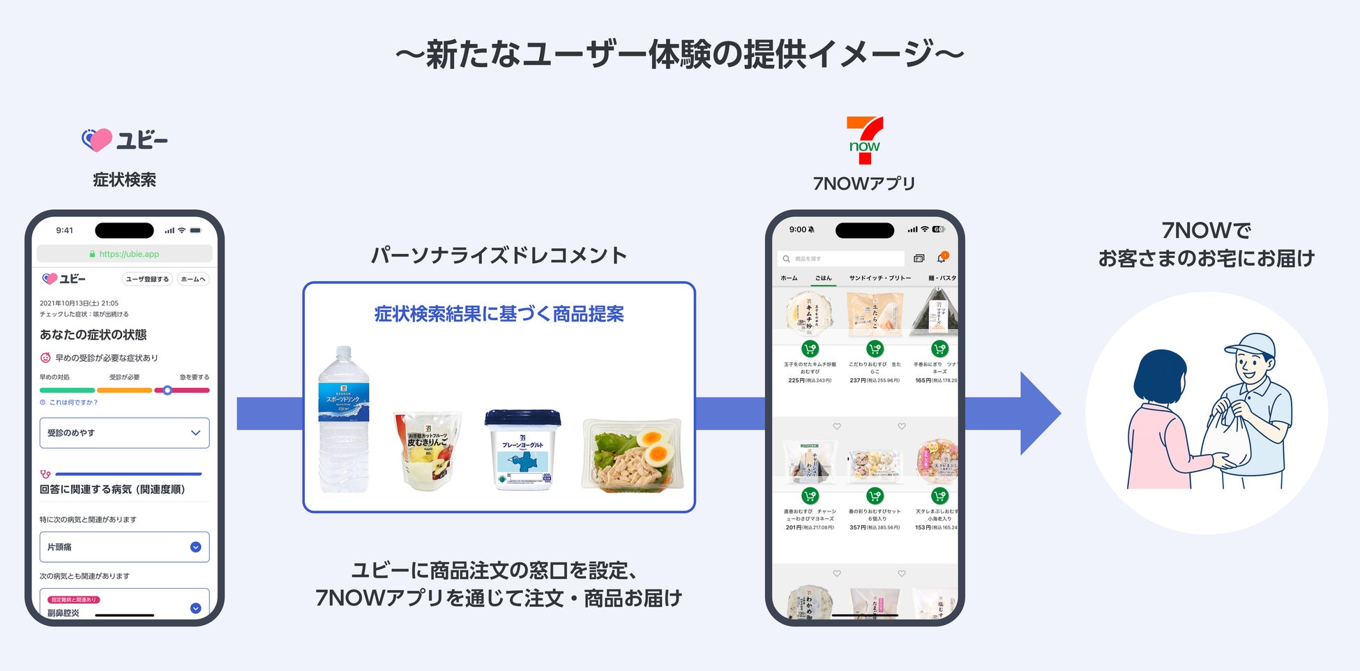 このたび、両社の提携における取り組みの第1弾として、セブン‐イレブンの商品お届けサービス「7NOW」と、症状検索エンジン「ユビー」との相互連携に関する実証実験を開始します。具体的には、「ユビー」を利用される体調不良で外出が難しいお客様に対して、症状検索結果の画面上にて「7NOW」のご利用を案内いたします。また、体調不良を感じたお客様が「7NOW」をご利用した際、注文完了後にシームレスに「ユビー」で症状を検索できるように連携いたします。