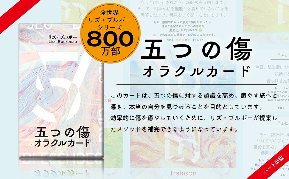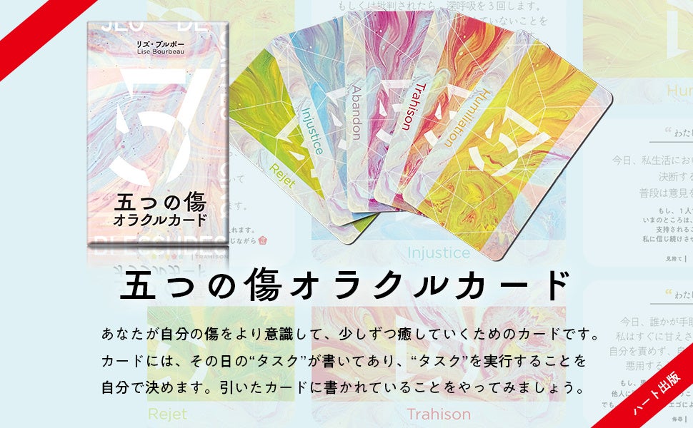 『五つの傷』シリーズは、世界中で300万部以上を誇る人気タイトル。内容をよりコンパクトにわかりやすく、ゲーム感覚で楽しみながら「心の傷を癒やす」オラクルカードとして新たにローンチされた。