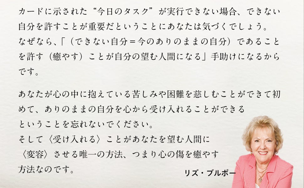 また、各カードには、癒やしのもっとも効果的な手段である〈受容〉を思い出させるメッセージも含まれている。これは、その日の“タスク”が実行できなかったときに、その現実を受け入れ自分を許すことで、傷を癒やす手助けにもなっている。