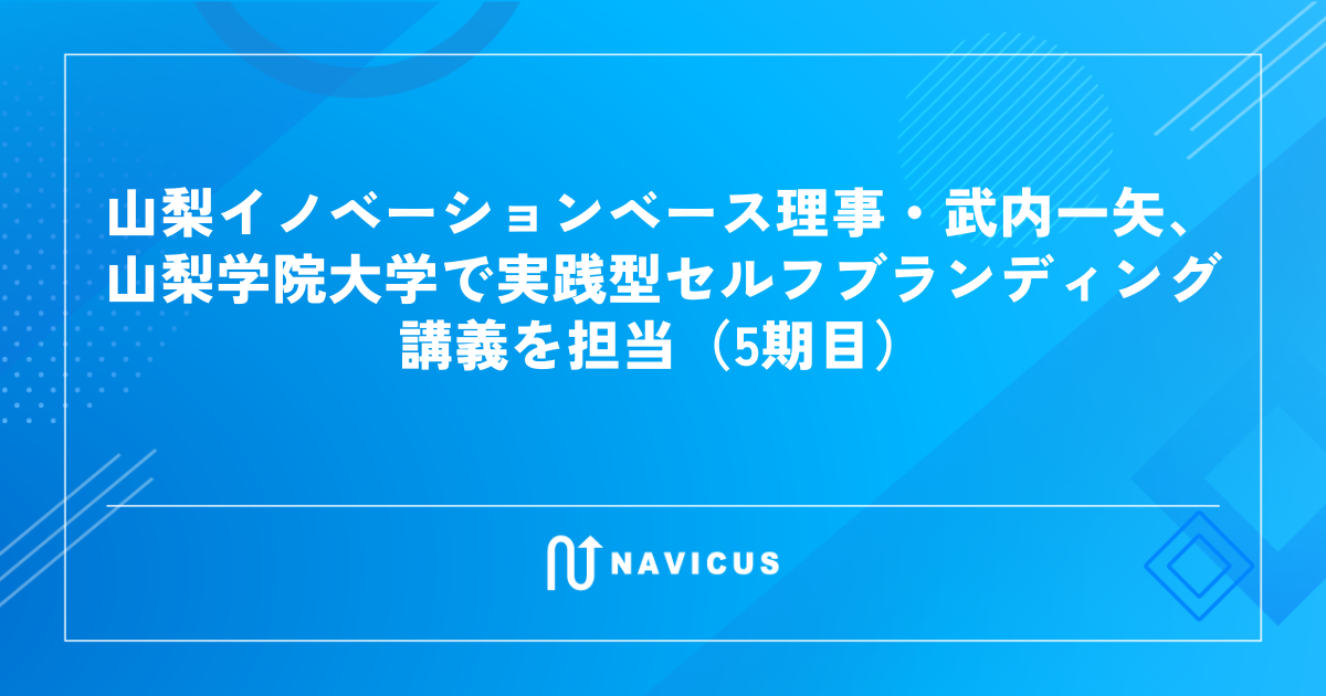 株式会社NAVICUSの代表取締役であり、一般社団法人山梨イノベーションベース(以下、YNIB)の理事を務める武内一矢は、山梨学院大学にて「セルフブランディング」をテーマとした講義を開講いたします。本講義は2022年より継続して実施しており、2026年度で5期目の開講となります。