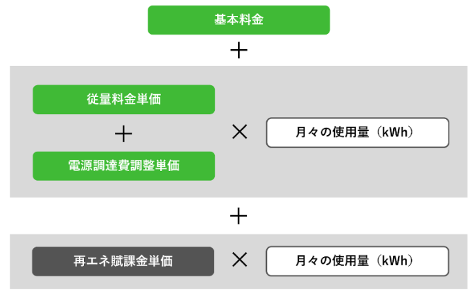 「RE100プラン」の電気料金は、基本料金+従量料金+電源調達費調整額+再エネ賦課金で構成されます。このうち電源調達費調整額が当社の仕入原価により変動します。