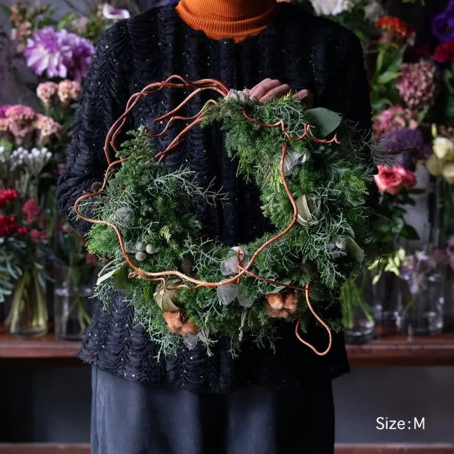 ブラウンのコントラストを加え、針葉樹の緑がより美しく映えるようにデザインしました。くねくねと曲がった赤ヅルがアクセントの、二つとして同じものはないリースです。