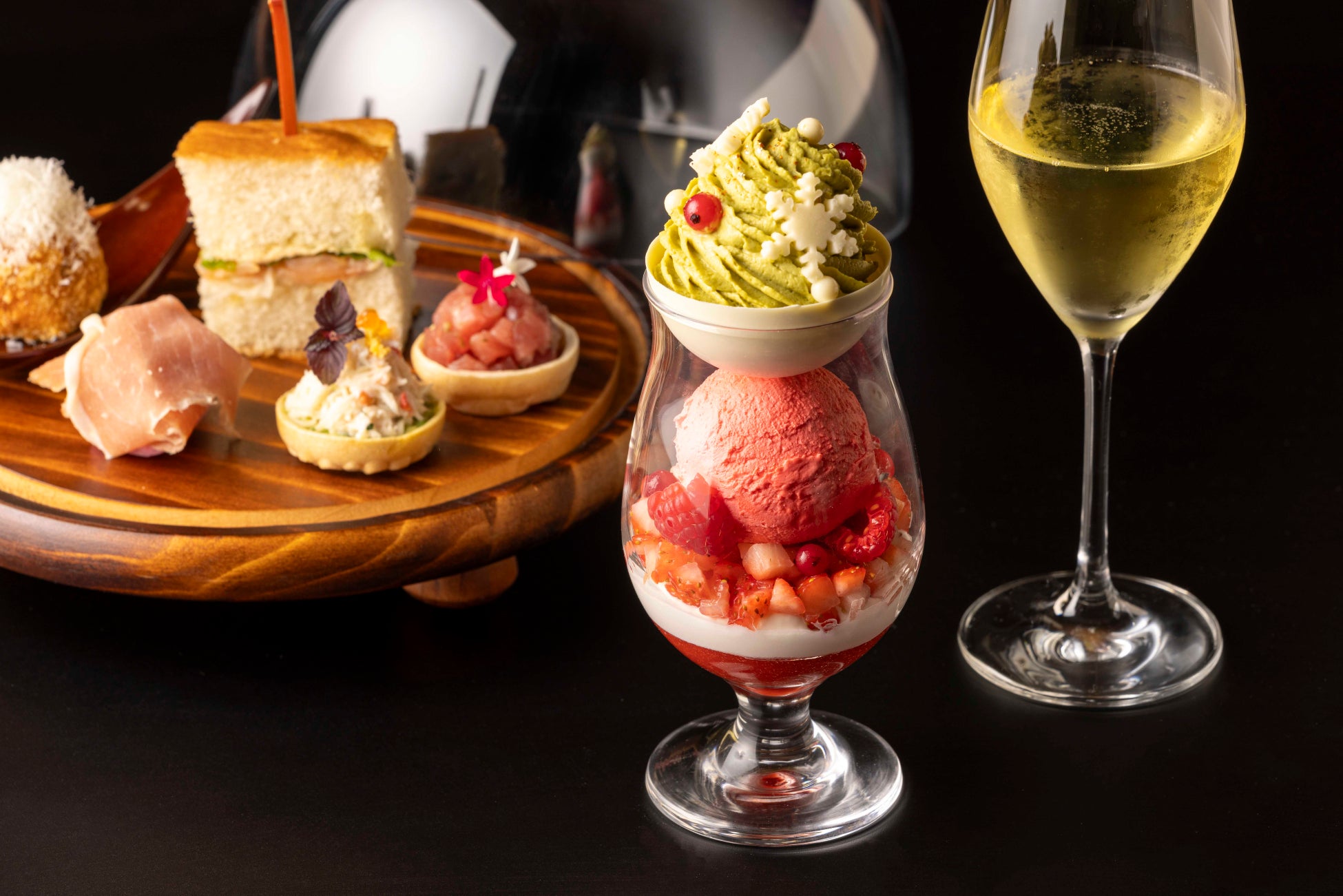 ティータイムには、スパークリングワインととともにクリスマスパフェ、セイボリーセットをお楽しみいただけます。いちごのアイスクリームとピスタチオのクリームでクリスマスツリーを表現したパフェはスパークリングワインとの相性も抜群です。
