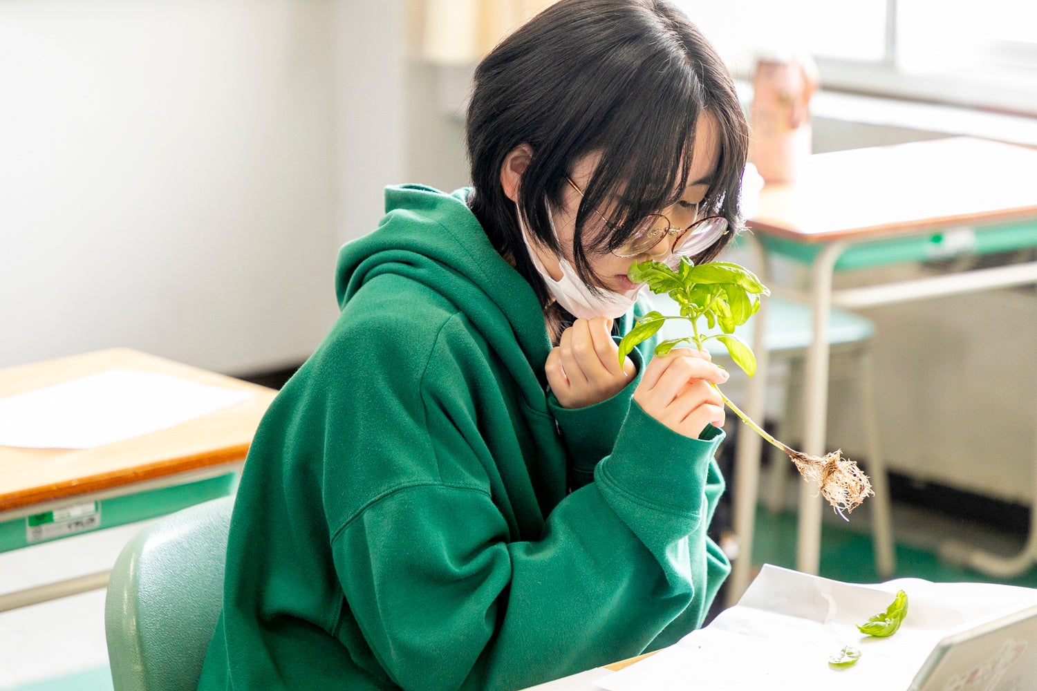 今回は、静修高校普通科に新設されたパティシエコースの第1期生を対象に授業を実施。香りの素材には、調理にまつわるハーブ(ルッコラ・バジル・パクチー)を採用しました。生徒たちは、ハーブの香りの主張の強さに驚き、特有の香りの違いを楽しみながら、浮かんだ情景や色、印象などを自由に言葉で表現していました。「香りから物語を創る体験は新鮮だった」「いかに日頃から視覚に囚われているかを実感した」など、新たな発見もたくさんあったようです。
