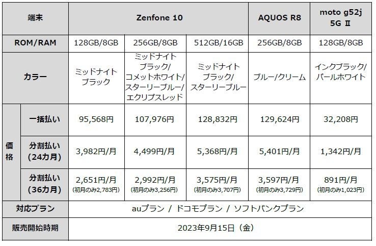 株式会社オプテージ(大阪市中央区)は、携帯電話サービス「mineo(マイネオ)」において、スマートフォン「Zenfone 10」「AQUOS R8」「moto g52j 5G Ⅱ」の販売を2023年9 月15日(金)より開始いたします。