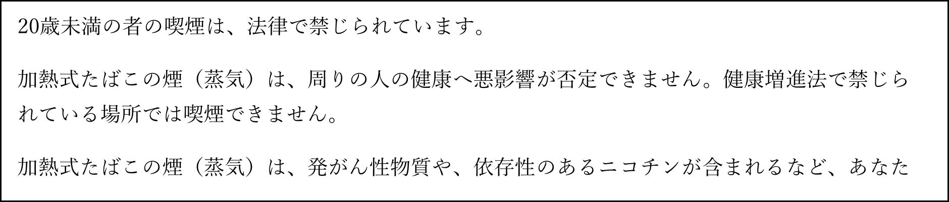 BATグループでは、たばこ製品のマーケティングを適切に実施するために国際的な自主規準を設定しています。そのため消費者に対するたばこ製品に関するすべてのコミュニケーションには、20歳未満の方へのコミュニケーションをお控えいただくとともに、「喫煙と健康に関する注意文言」を表示することを関係各位にお願いしております。加熱式たばこに関しては、記事掲載していただく際には、「健康に関する注意文言」が表示されるようご配慮いただきたく存じます。ご協力の程、何卒よろしくお願い申し上げます。