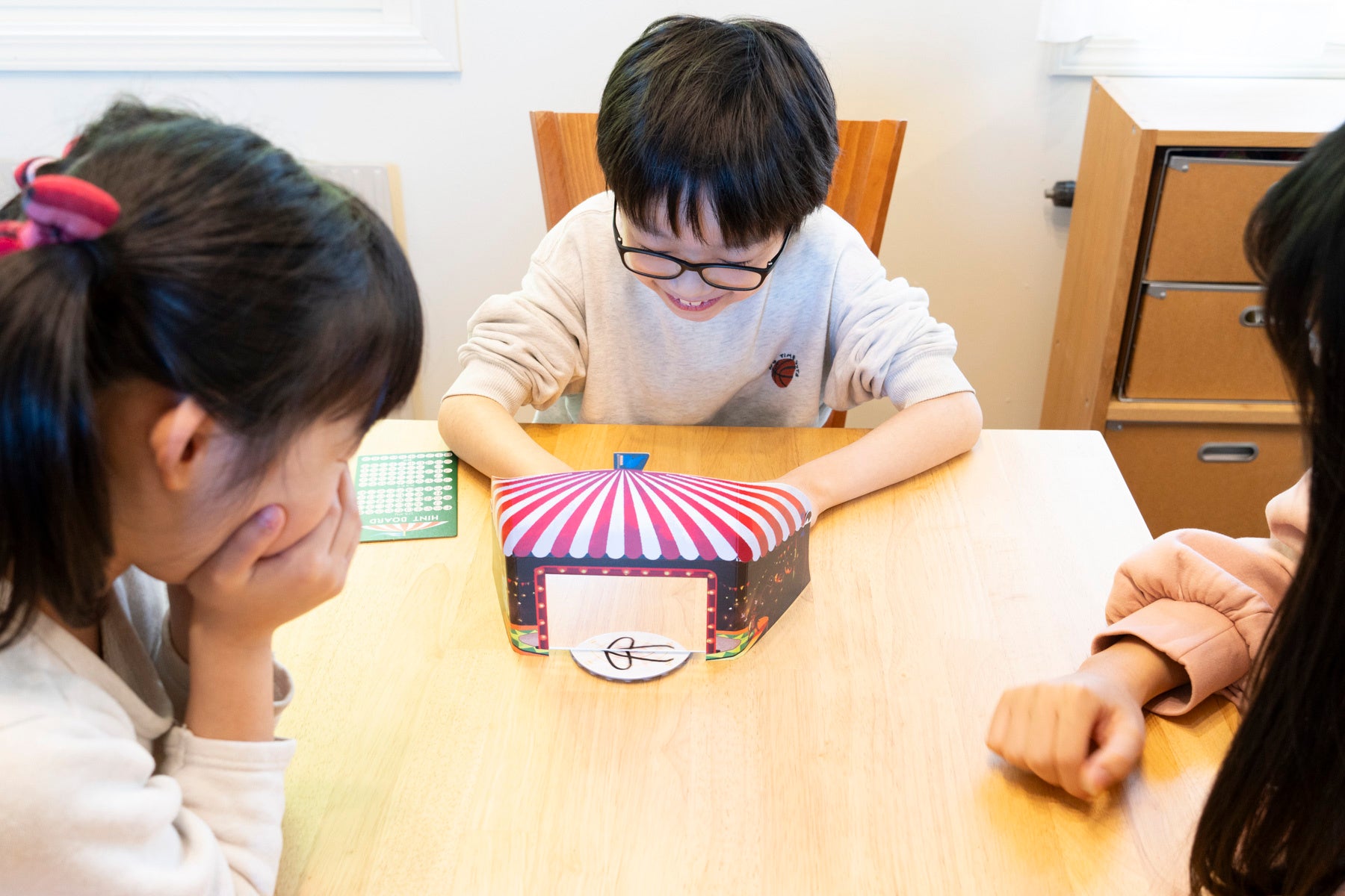 サーカス小屋の衝立からボードの一部が出てきてクルクルと回ります。このゲームは文字の読み書きができるようになる小学生の頃から遊べます。出題ヒントボードには、小学1年生で習う漢字もまとめられているので安心です。
