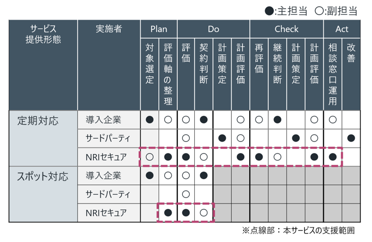 リスク評価・管理を一度行った後も、相談窓口を常設することで、サードパーティ管理における改善活動の中で浮上した課題に対し、対策のアドバイザリ等を継続して実施することができます。※継続的なサイバーセキュリティ・デューデリジェンスを行わない場合にも、サービス提供は可能です(図を参照)。