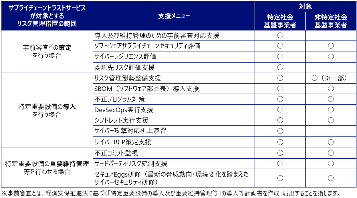 NRIセキュアでは、本サービスの他にも経済安全保障推進法に基づきリスク対策を総合的に支援する「サプライチェーントラストサービス」を提供しています。支援メニューについては、以下の一覧表をご参照ください。