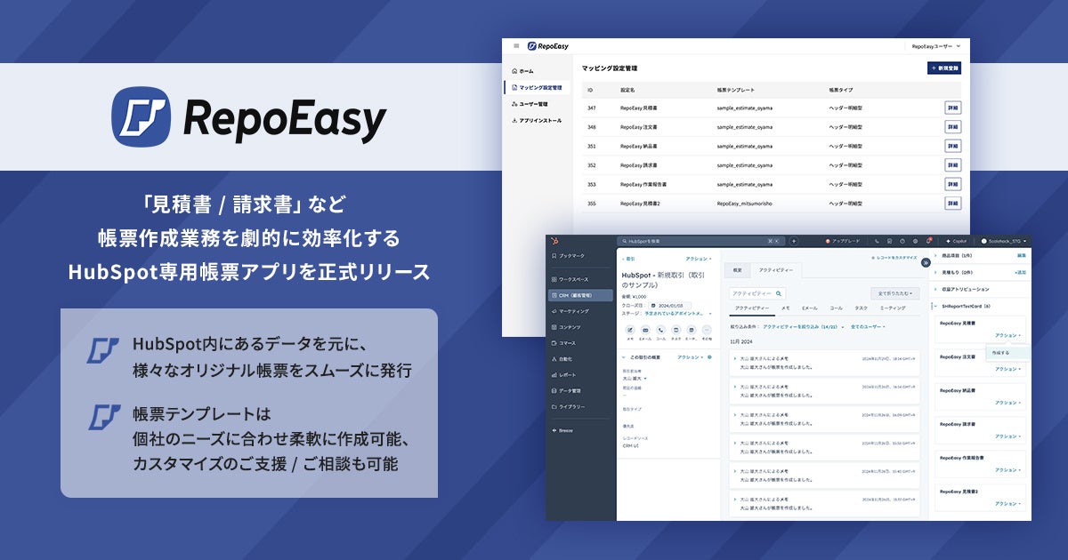 HubSpotを利用する企業にとって、帳票機能は補完的な位置付けではありますが、実際の取引においては非常に重要です。RepoEasyはHubSpot内で完結するワークフローを提供することで、HubSpotにおける業務全体の一貫性を担保しながら、帳票のデザイン性や正確性を高めることで取引先の信頼を獲得し、日本市場でのHubSpotの導入促進および既存顧客の継続利用に貢献していきます。
