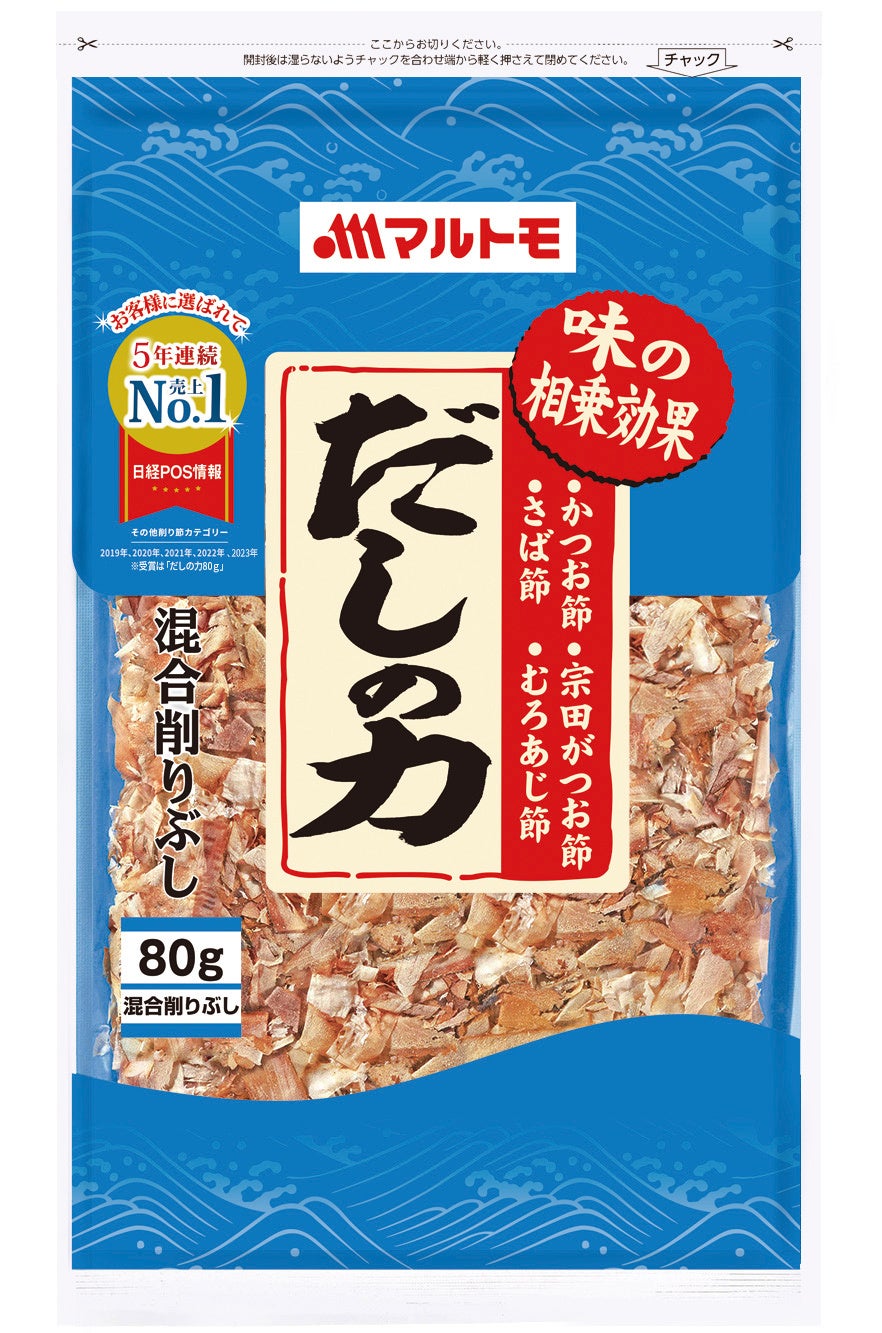 「だしの力」は2007年に発売し、長期にわたり消費者の皆さまにご好評をいただいている混合削りぶしです。深い雑味のある宗田がつお節を中心に、さば節とむろあじ節、かつお節の4種類をブレンドして味のバランスを整えました。4種の削りぶしの相乗効果で複雑味のある濃厚なだしが取れる商品です。なお、「その他ドッグフードカテゴリー」においては、マルトモ「減塩かつおだいすき40g」も売上No.1(2年連続)を獲得しました。