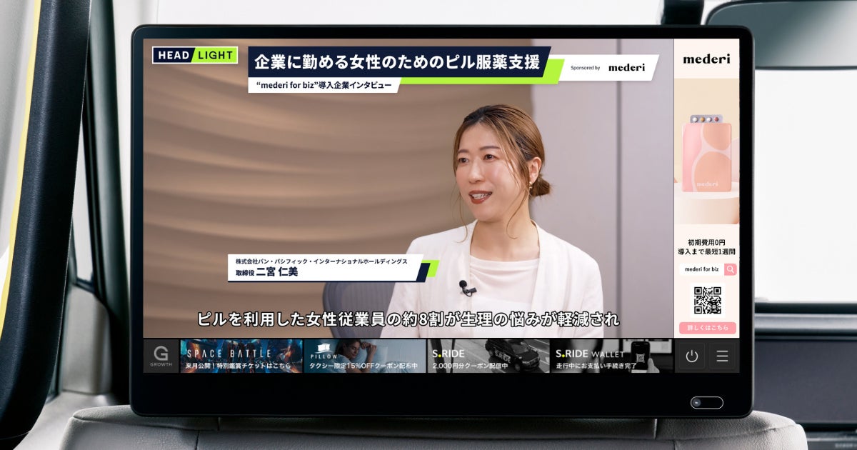オンラインピル診療サービス『mederi Pill(メデリピル)』を提供するmederi株式会社(本社:東京都目黒区、代表取締役 坂梨 亜里咲 以下、mederi)は、タクシーサイネージメディア「GROWTH」車内で放映される移動時間の情報番組「HEADLIGHT」に出演する運びとなりました。