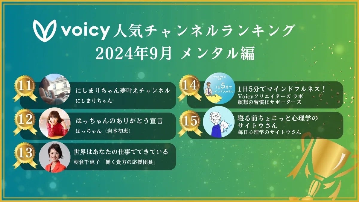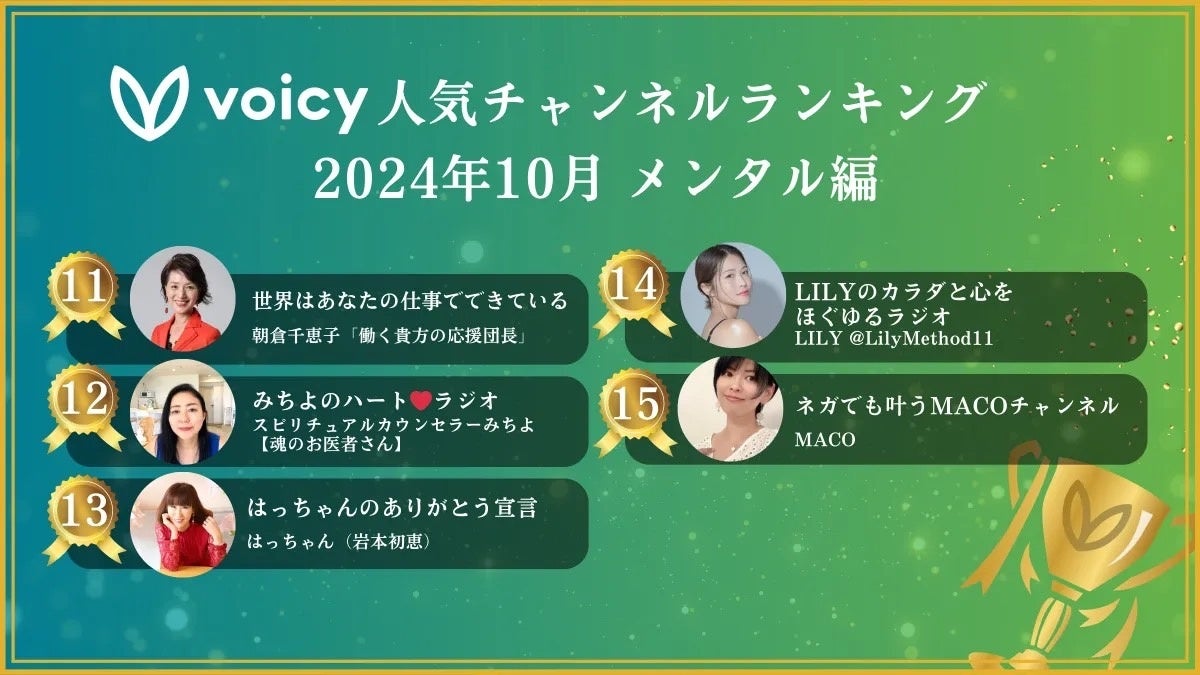 なお、「ありがとう宣言」はVoicyのメンタル編においても2ヶ月連続でトップ13にランクイン(9月12位、10月13位)し、引き続き多くの方に愛聴されています。