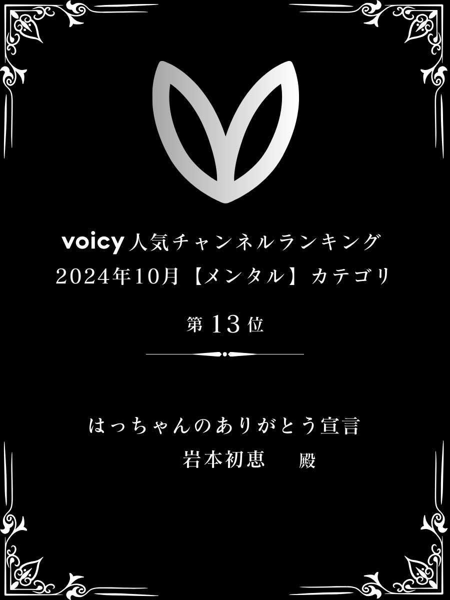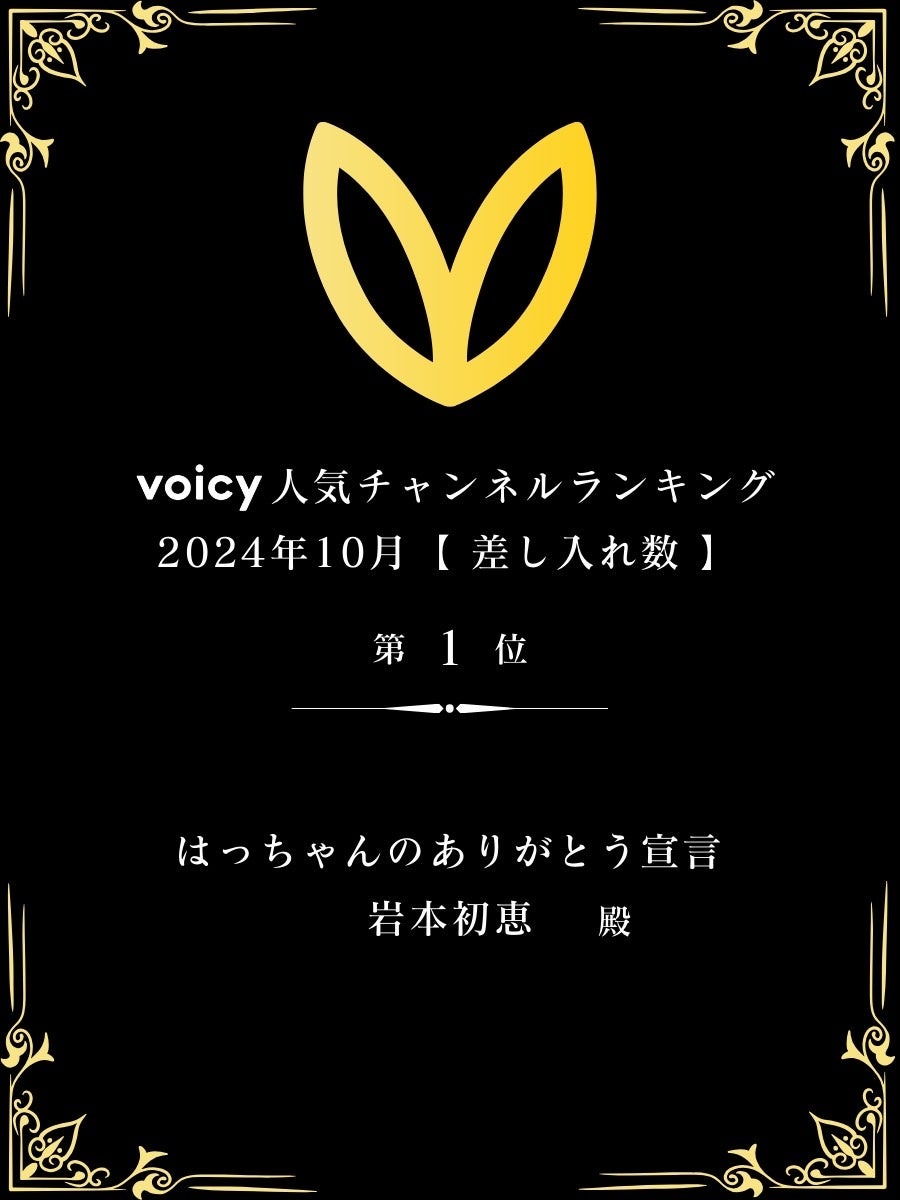 株式会社愛とーとの代表・岩本初恵(愛称:はっちゃん)が配信するVoicyチャンネル「はっちゃんのありがとう宣言」が、2024年10月度「差し入れランキング」で1位を獲得しました。