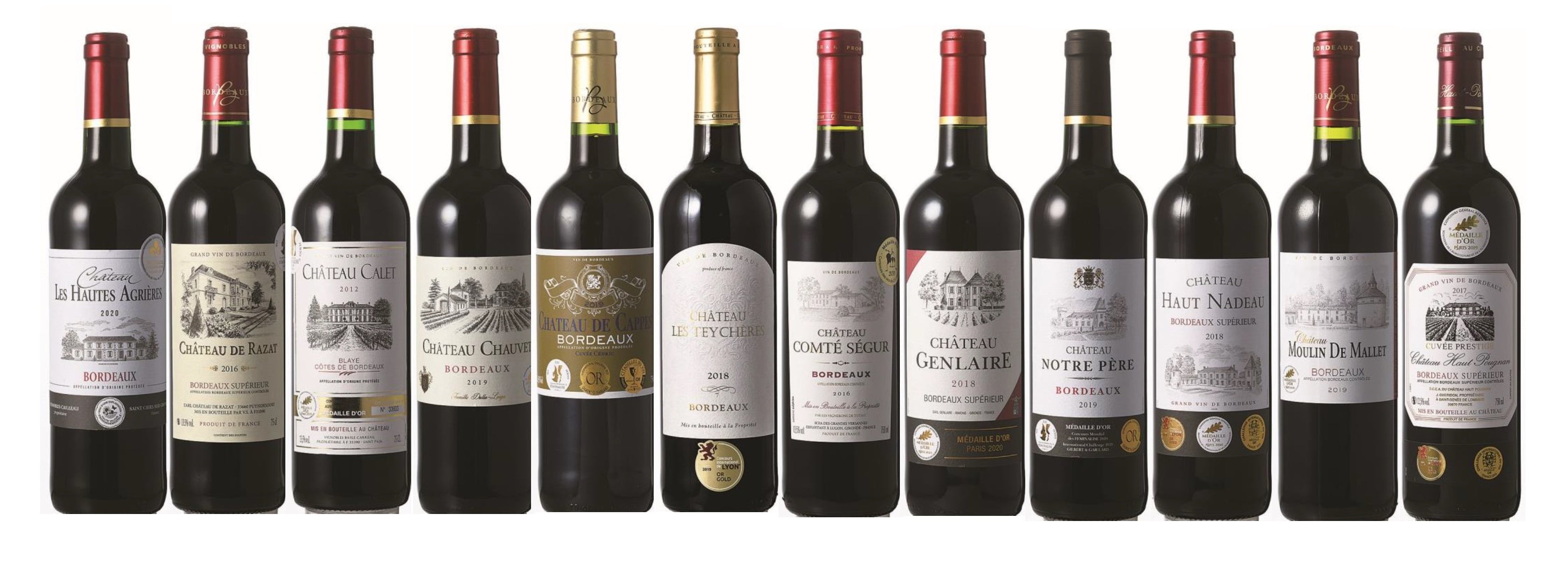 ワイン銘醸地であるボルドーワインの中でも各コンクールで金賞に輝いたワインを12種類集めました。さらに今回はボルドーでも格上の地域のワイン5種を含みます。