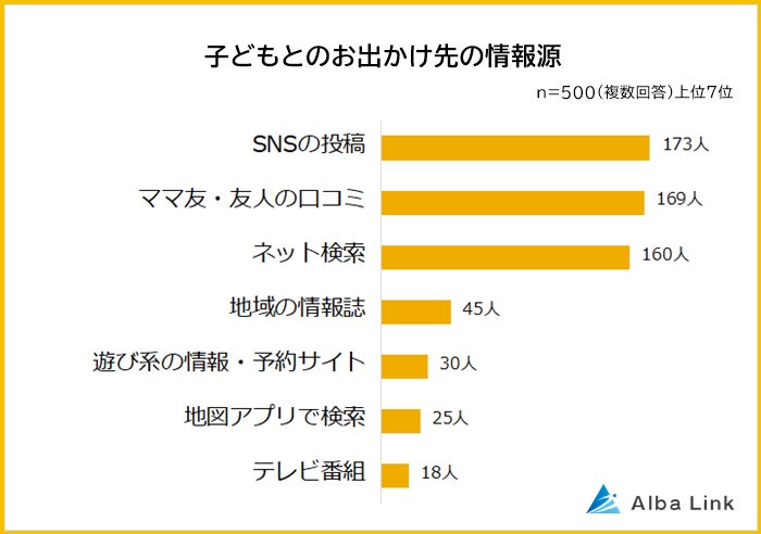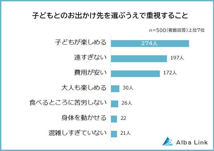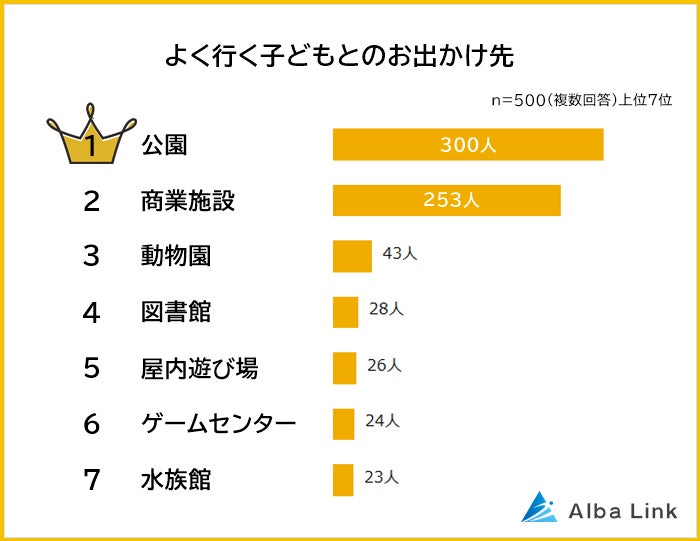 株式会社AlbaLink(本社:東京都江東区、代表取締役:河田 憲二)は、小学生までのお子さんがいる500人を対象に「子どもとお出かけする場所に関する意識調査」を実施し、そのデータをランキングにしました。