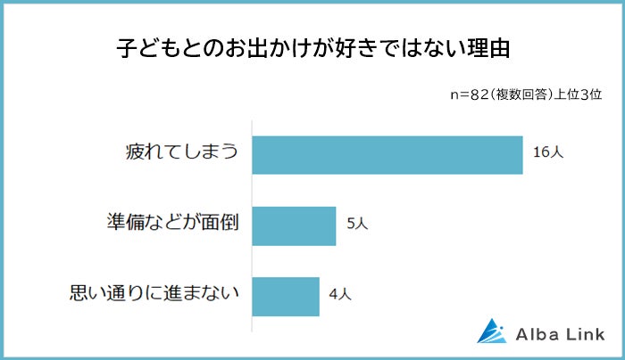 「子どものとのお出かけは好きではない」と回答した人の理由1位は「疲れてしまう(16人)」でした。お子さんが元気いっぱいで目を離すとすぐに遠くへ行ってしまうタイプの場合、危険なことがないように親御さんも動きまわる必要があって疲れますね。「インドア派なので外出自体がそもそも苦痛」という人もいました。