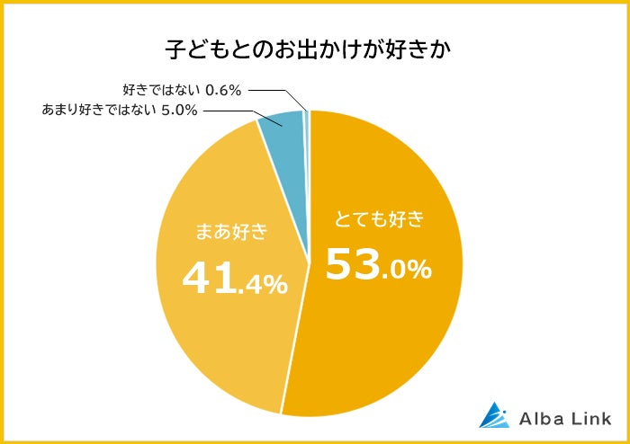 小学生までのお子さんがいるパパママに「子どもとのお出かけは好きですか」と聞いたところ、「とても好き」「まあ好き」と答えた人が94.4%。「とても好き」と答えた人だけで過半数を超えていて、お子さんとの外出を楽しみにしている人が多いとわかります。