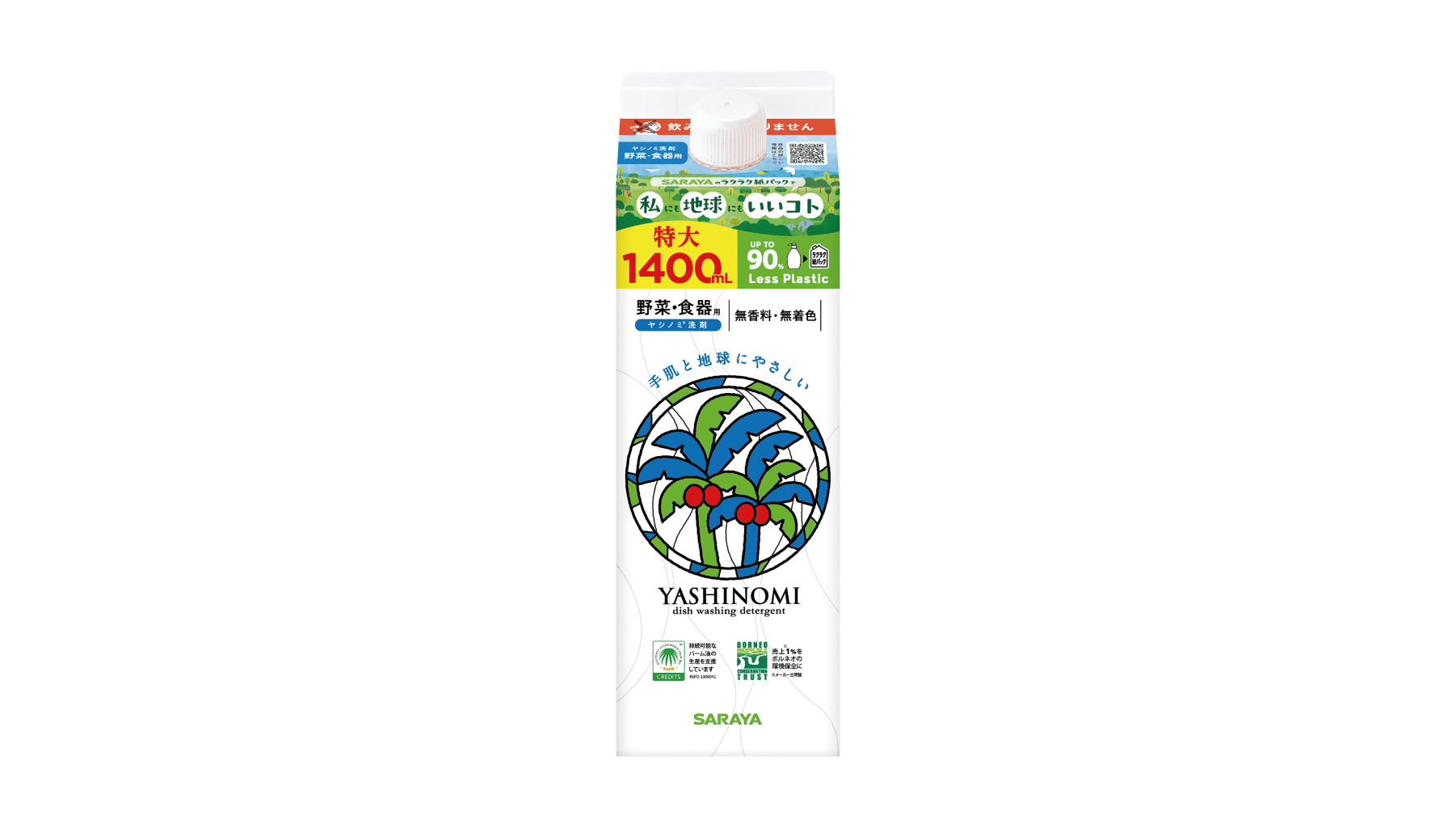 今回、2025年7月に発売した「ヤシノミ洗剤 詰替用1900mL」に続く商品として、「ヤシノミ洗剤 詰替用1400mL」を紙パックタイプでリニューアル発売致します。サラヤとして取り組むプラスチック量の削減と、使いやすさを追求しました。