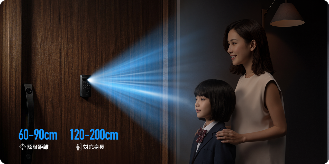 本製品は、これまでの3D顔認証に加え、新たに「手のひら静脈認証」(※1)を搭載。マスクや帽子で顔認証が難しい場面や、指紋が薄く従来の認証が通りにくい方にも対応できる、より多様なシーンに強い認証技術です。手のひら内部の静脈パターンを高精度に読み取ることで、双子でも識別可能な認証精度を実現。誤認識率はわずか0.0001%未満(※2)で、写真や動画、偽物の手などによる不正解錠も防ぎます。操作は非接触で、手をかざすだけの衛生的でスムーズな解錠体験を提供します。6歳以上のお子さまから大人まで、手の汚れや身長差を気にせずお使いいただけます。