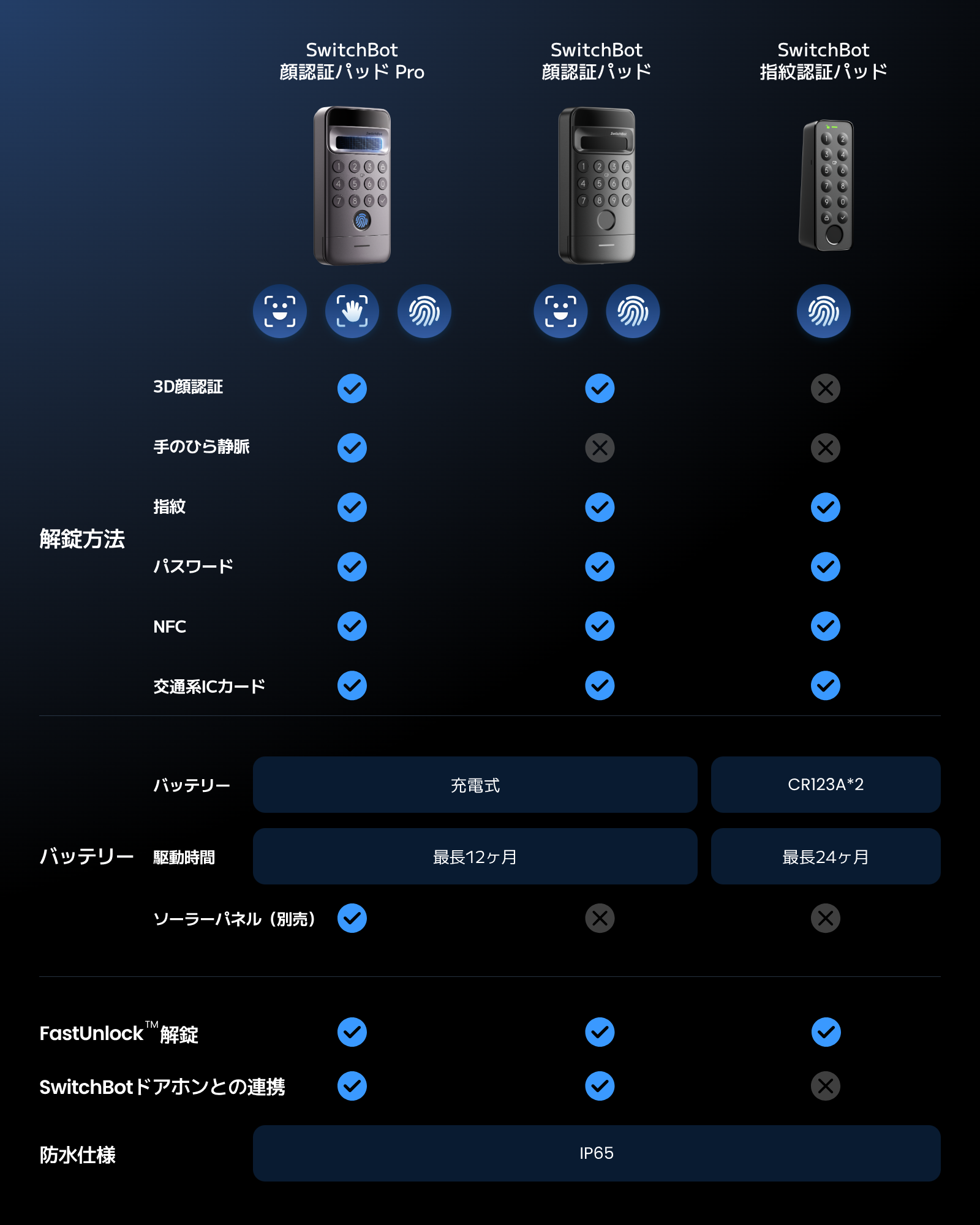 【顔認証パッドPro/顔認証パッド/指紋認証パッド機能比較】