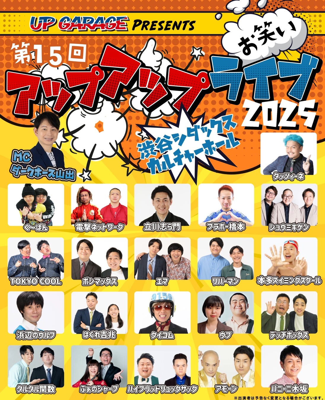 カー&バイク用品のリユース専門店「アップガレージ」を全国展開する株式会社アップガレージグループ(本社:神奈川県横浜市、代表取締役社長:河野映彦)が主催するお笑いライブイベント「第15回 アップアップライブ2025」を、2025年6月11日(水)に開催いたします。