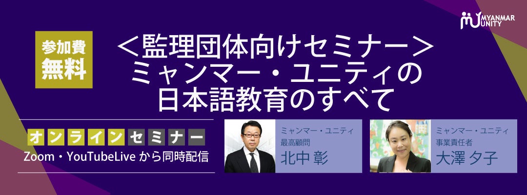 ミャンマー政府認定No.1人材送り出し機関「ミャンマー・ユニティ」は、新型コロナ蔓延の当初からオンライン日本語教育を充実させ、監理団体様や受け入れ企業様に高い評価をいただいております。ミャンマーの歴史的教育背景から現在実施しているオンライン教育までをご説明している<監理団体向けセミナー>「ミャンマー・ユニティの日本語教育のすべて」を2022年1月19日(水)11時より開催しましたが、今回その録画動画の公開をいたします。