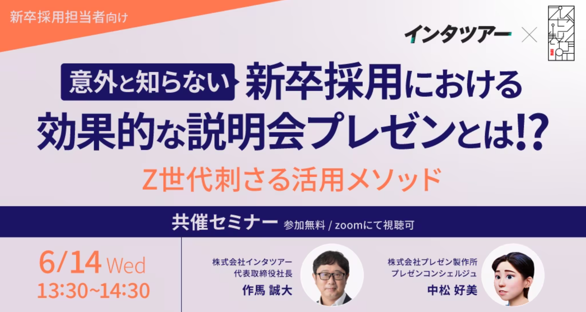 新卒採用向けのリレーション採用プラットフォームを提供する(株)インタツアー(代表:作馬 誠大、本社:東京都港区浜松町)は、2023年6月14日(木)に、新卒採用担当者向けオンラインセミナー『意外と知らない 新卒採用における効果的な説明会プレゼンとは!?Z世代刺さる活用メソッド』を開催いたします。