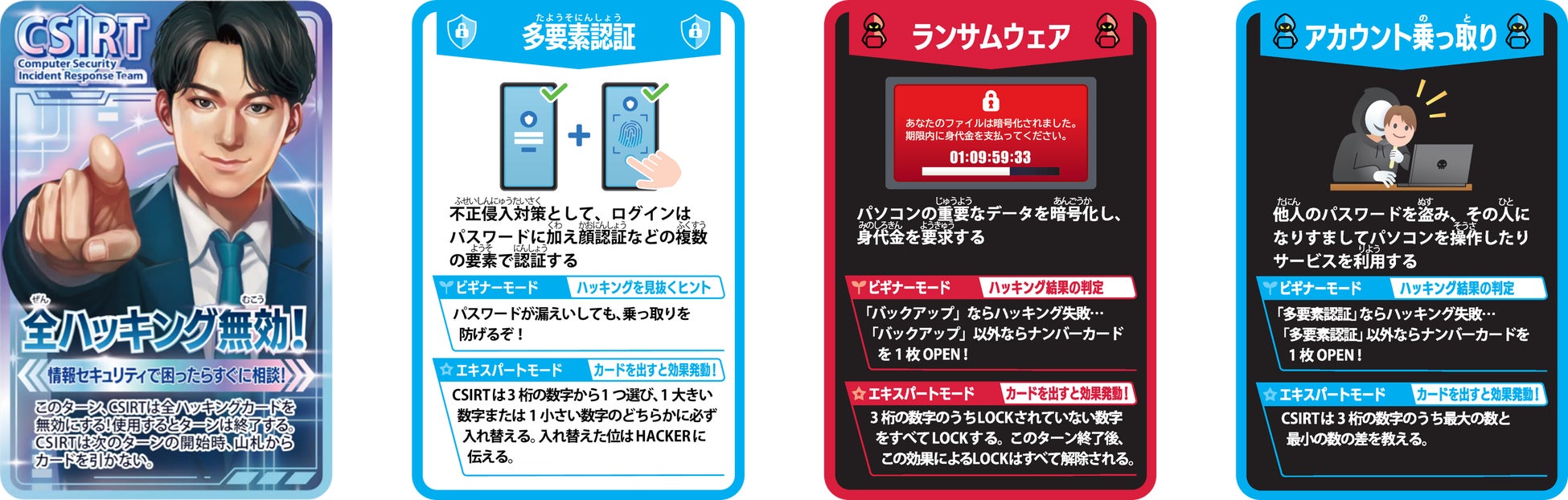 本カードゲームは、プレイヤーのレベルに応じて、セキュリティに詳しくない方も遊びやすい「ビギナールール」と、駆け引きや戦略性を楽しめる「エキスパートルール」の2種を用意。プレイヤーはそれぞれの立場から手札を駆使して心理戦を繰り広げる中で、自然とセキュリティ知識を身につけることができます。