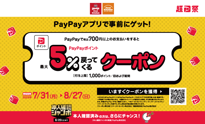 ウェンディーズとファーストキッチン「PayPay」利用で最大5%のPayPayポイント付与クーポンキャンペーン実施!7/31(月)から全店で 税込700円以上のお支払いで戻ってくる