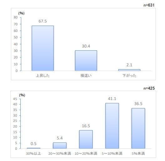 上昇続く従業員給与:「上昇した」6割超 上昇率 10%未満 7割超