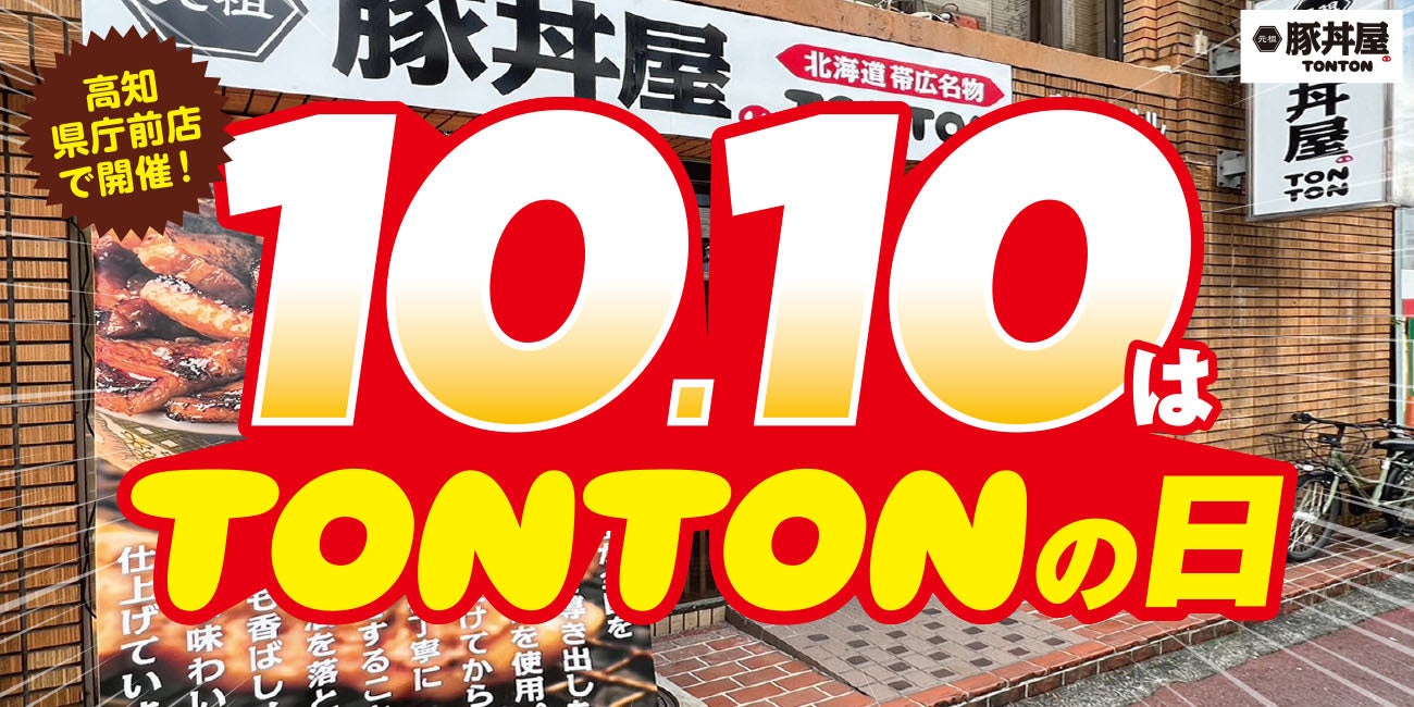 ワンズトライン株式会社(本社:大阪市北区芝田2丁目3番16号、代表取締役:山内仁)が運営する、北海道・帯広伝統の豚丼が人気の「元祖豚丼屋TONTON 高知県庁前店」(住所:高知県高知市升形1-22、TEL:088-879-9438)で、'23年10月10日(火)「TONTONの日」にスペシャルイベントを開催いたします。年に一度のスペシャルイベント!皆さまのご来店を心よりお待ちしております。