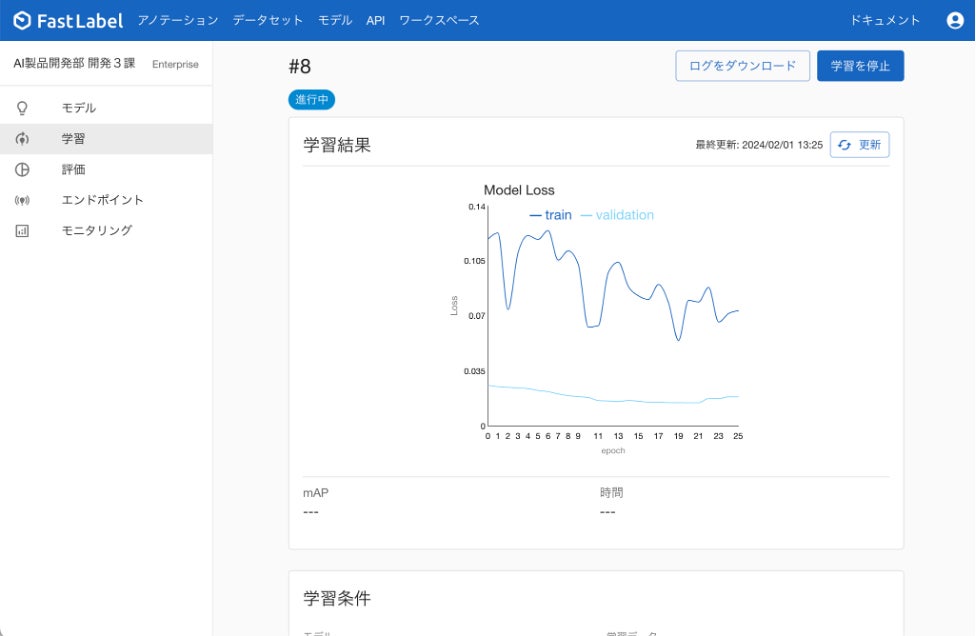 学習機能において、学習過程の損失関数(loss)のグラフの確認と、学習の停止ができるようになりました。