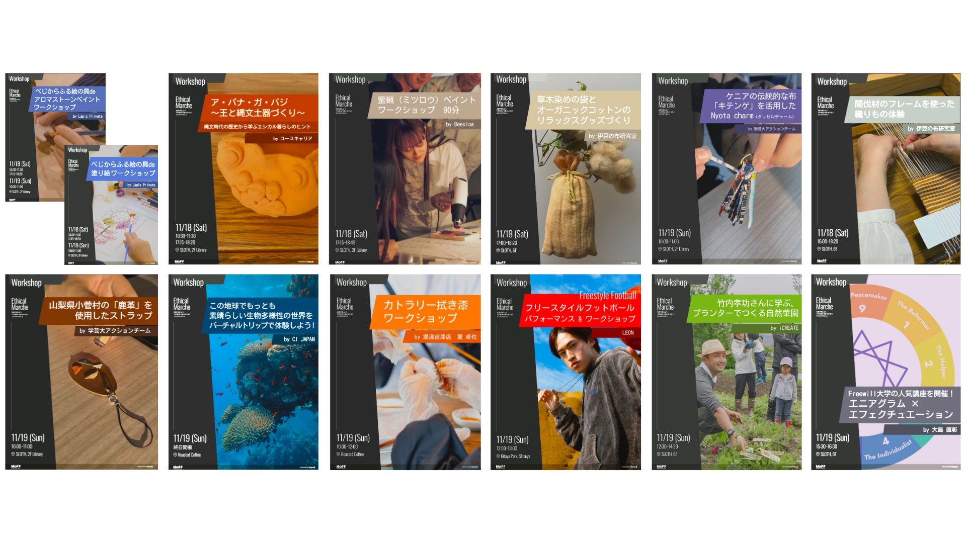 2日間で開催される16個のワークショップを紹介いたします。国内外の伝統文化体験ができるものや自然由来グッズの製作ができるものまで多様なワークショップをご用意しています。詳細や申込方法は下記イベントページのワークショップタイムテーブルからご覧ください。
