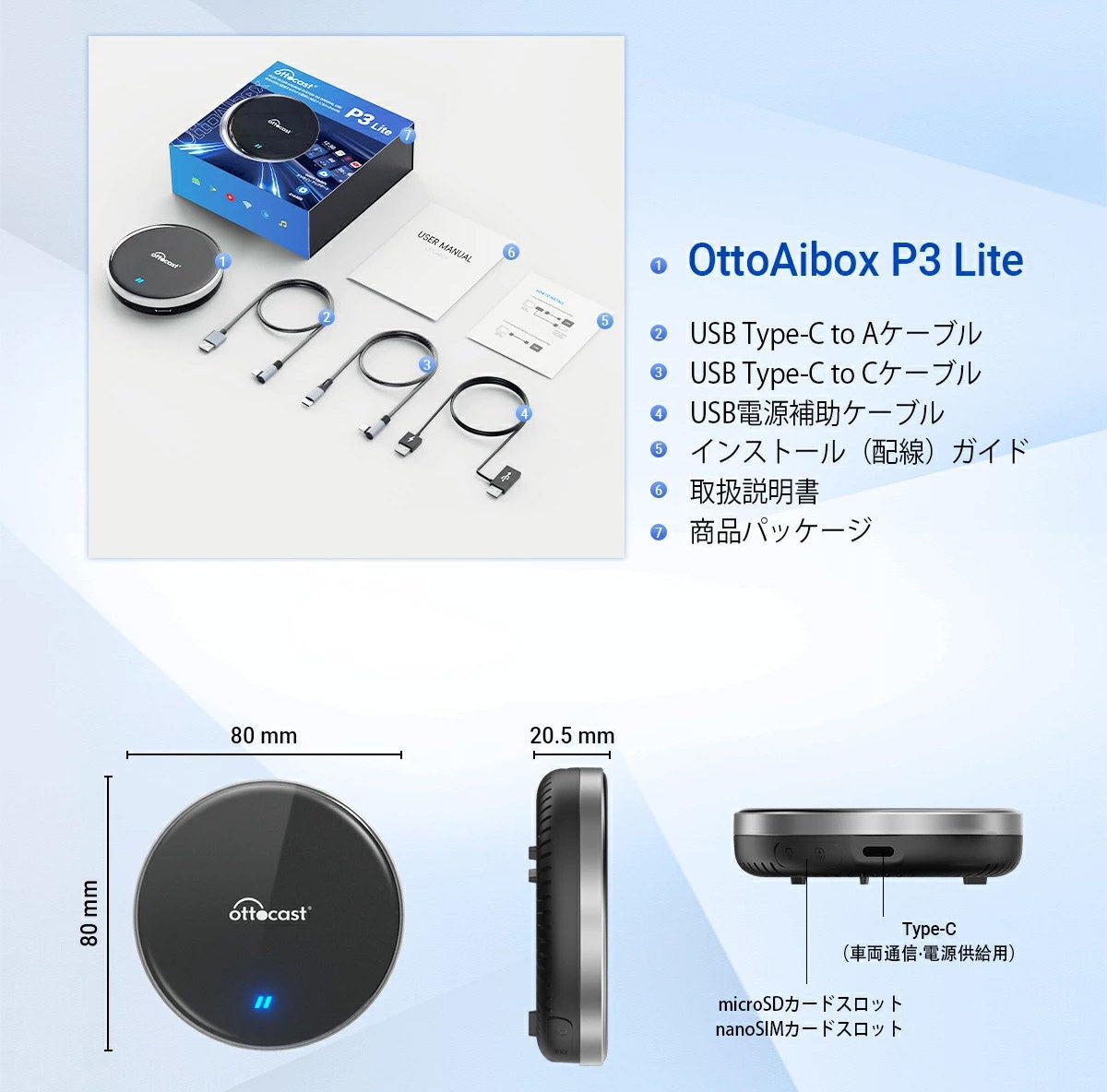 Otto Aibox P3は自動車用のスマートガジェットです。 Android 12のOSを搭載、ケーブルで車のUSB端子に接続すると、あなたの車でスマホと同じようにナビ案内、通話や映画、音楽鑑賞などができるようになります。